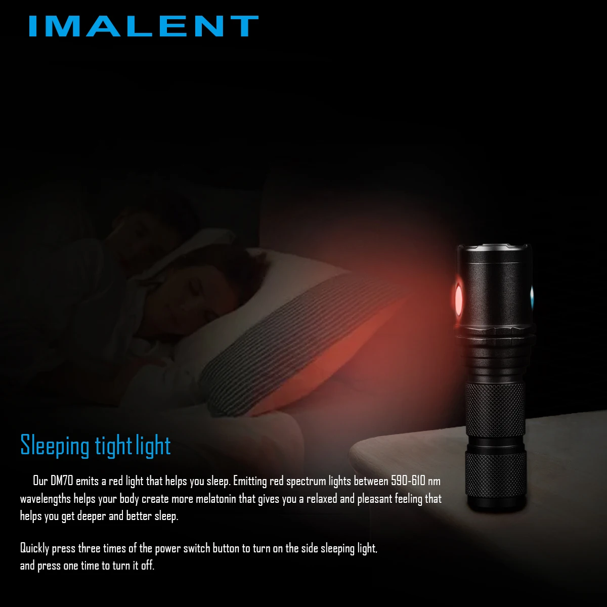 Спальный плотный светильник: наш DM70emits красный светильник, который поможет вам спать. Излучение Красного спектра между длинами волн 590-610nm помогает вашему телу создать более мелатонин, что дает вам расслабленное и приятное ощущение, которое поможет вам получить более глубокий и лучший сон.