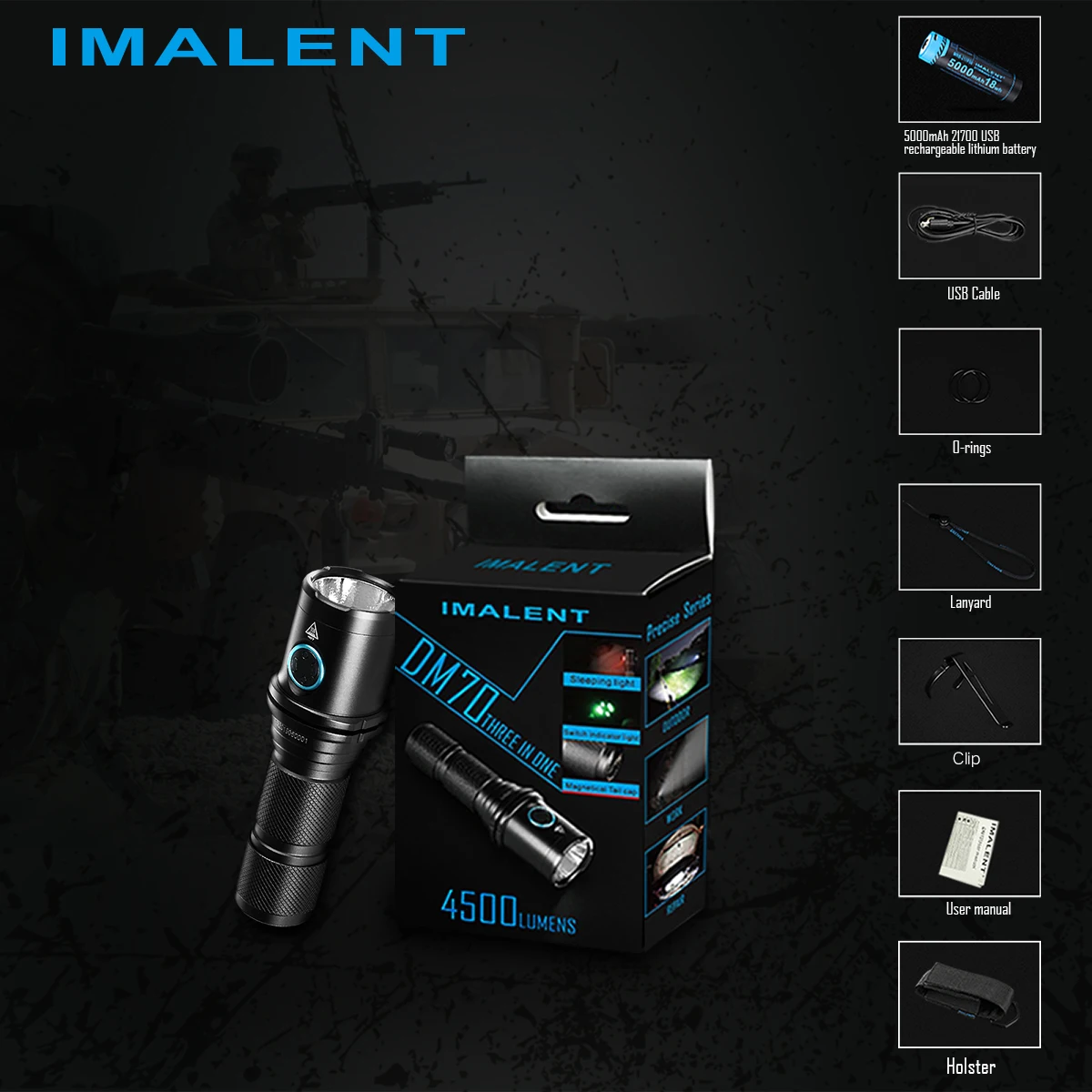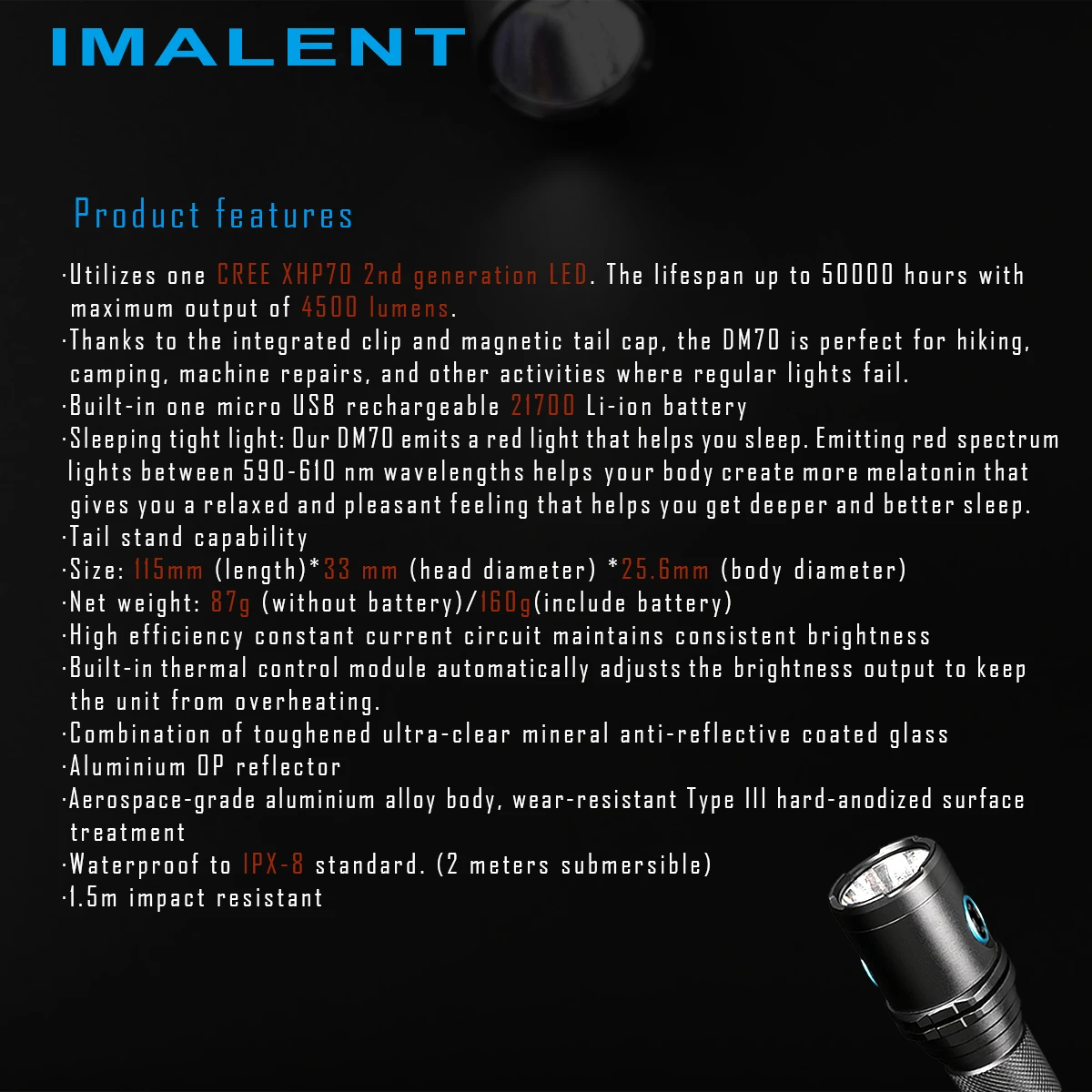 Imalent DM70 является перезаряжаемым фонариком с компактным размером, но высокой производительностью. Всего 115 мм в длину, этот компактный корпус излучает максимальную мощность 4500 люменов и расстояние луча 306 метров. Он использует один литий-ионный аккумулятор micro USB 21700. Включает магнитную хвостовую крышку, которая может освободить руки бесплатно для работы. Кроме того, индикатор на выключателе отображает состояние батареи в реальном времени, 5 уровней выхода плюс режим стробоскопа, подходит для ежедневного использования, активного отдыха и ремонтных работ.