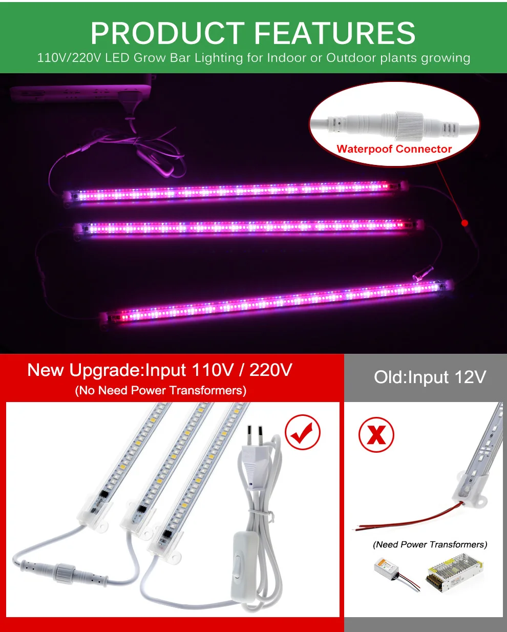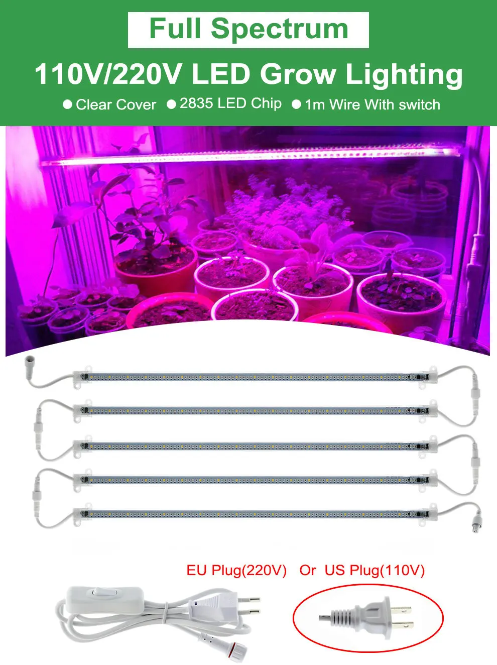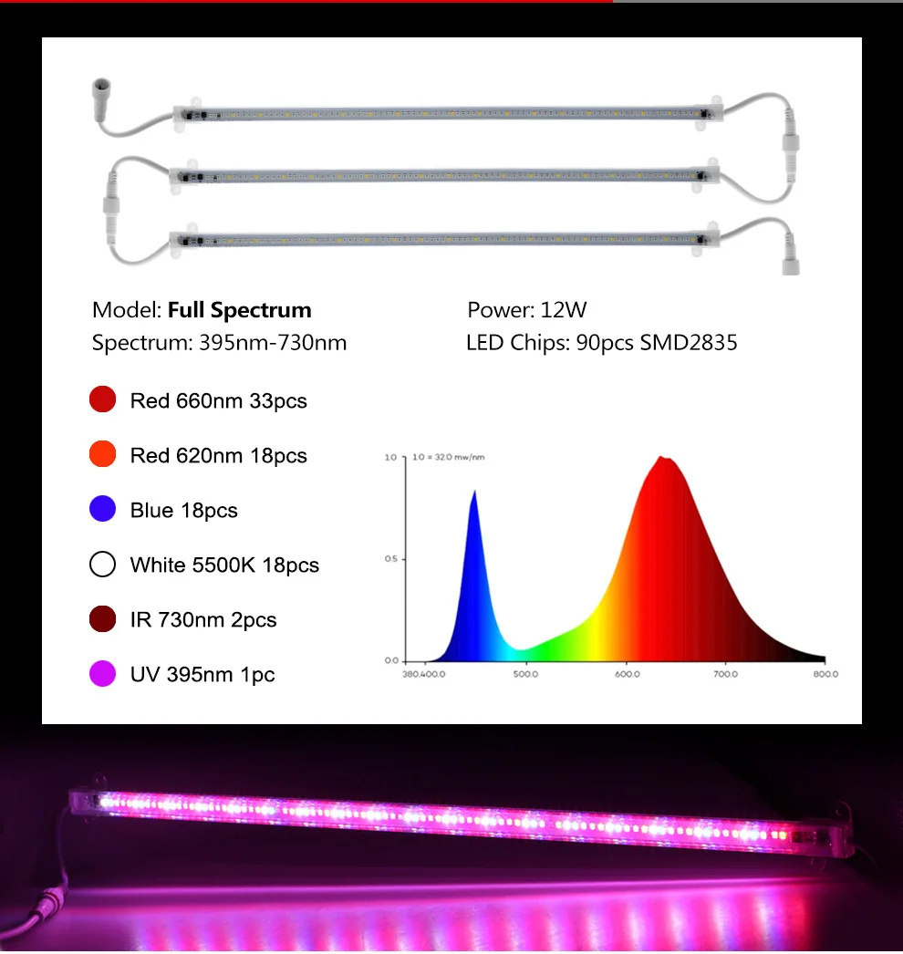 (Красный 660нм 33 шт., красный 620нм 18 шт., синий 18 шт., белый 5500 к 18 шт., ИК 730нм 2 шт., УФ 395нм 1 шт.) Примечание:1. У нас есть два типа ламп для выращивания,110 В штепсельная вилка США и 220 В штепсельная вилка европейского стандарта, Пожалуйста, выберите в соответствии с потребностями вашей страны.2. Вы можете выбрать набор ламп для выращивания с дополнительным удлинительным проводом, Длина удлинительного провода составляет 50 см.В комплект «1 шт.» не входит удлинитель. (Для получения конкретной информации, пожалуйста, проверьте наши фотографии товара)3. Длина110 В Светодиодная лампа для роста 40 см; Длина220 В Светодиодная лампа для выращивания 50 см.4.Эти темные огни (УФ и ИК) являются нормальными. ThИК (инфракрасный) и УФ-светодиоды выглядят тусклыми, но не неисправными. Они играют важную роль в росте и развитии растений.
