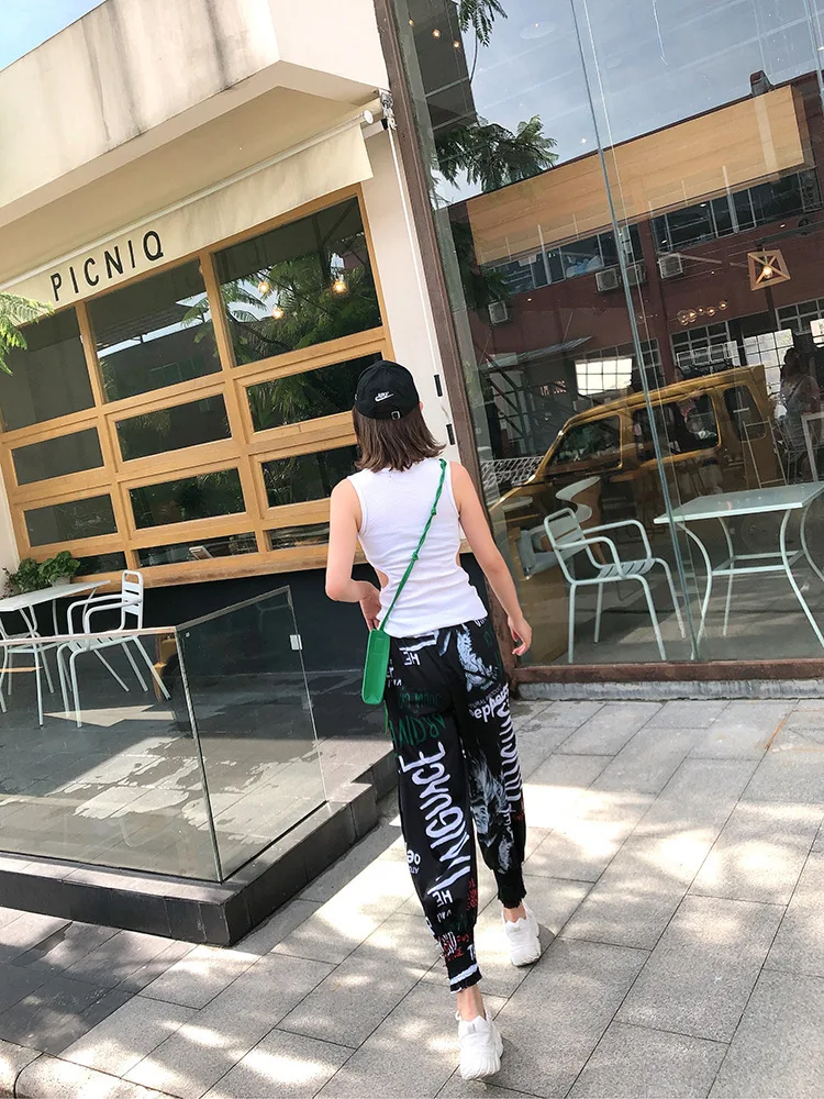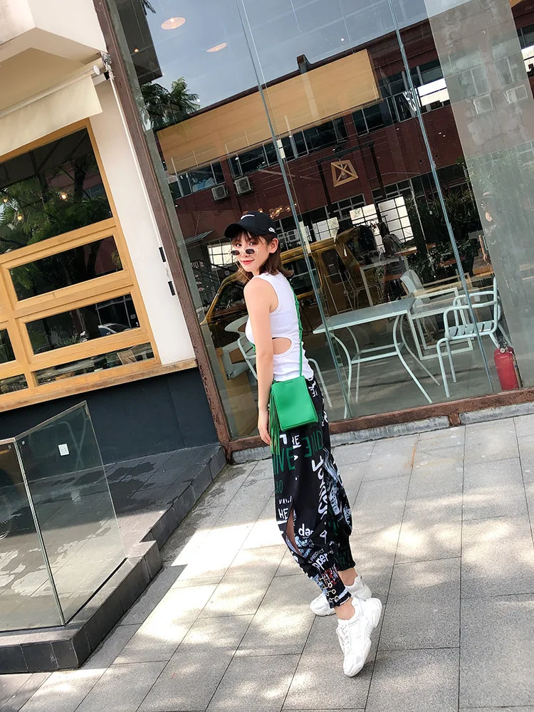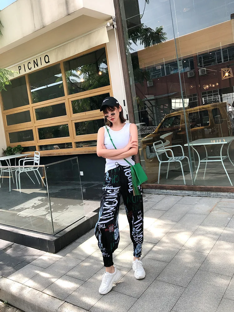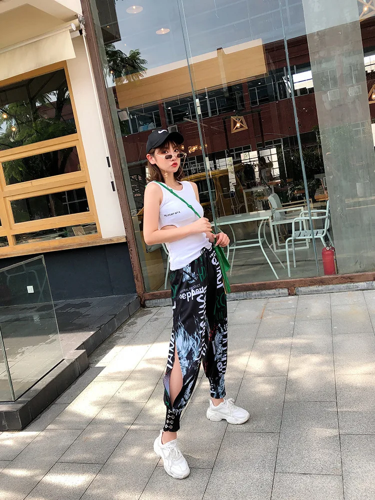 QING MO Women Letter Print High Waist Trousers Women Summer Fork Trousers
