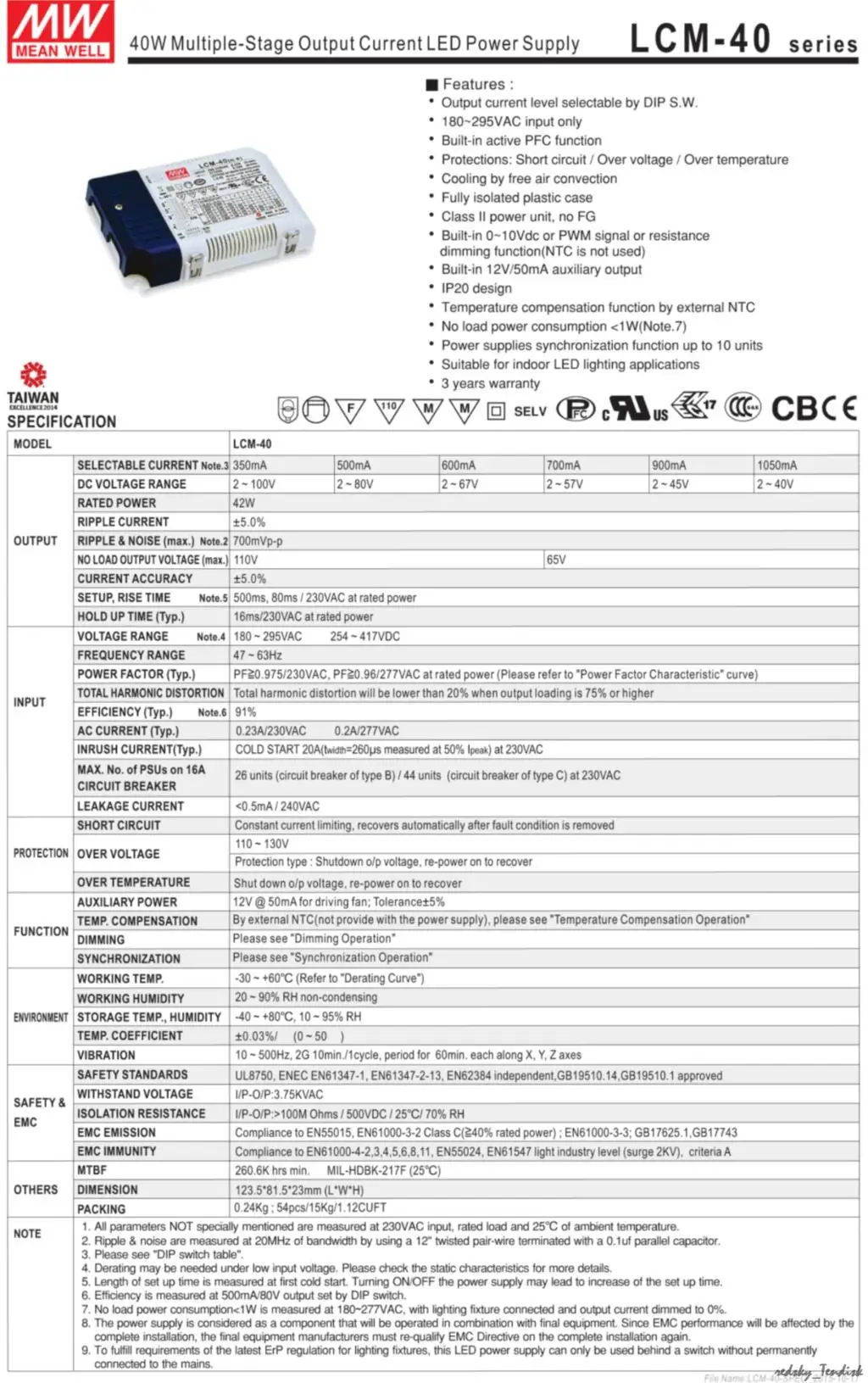 Серия LCM является единственным вариантом многоскоростного тока в среднем устьевом источнике питания (с помощью дип-переключателя) с затемнением. Режим работы с постоянным током, основной тип затемнен контрольной линией (ШИМ или напряжение), тип DA затемнен встроенным интерфейсом и кнопкой DALI, и имеет функцию активной коррекции коэффициента мощности. В настоящее время существуют уровни мощности 25 Вт, 40 Вт и 60 Вт, а выходной ток 350 мА, 500 мА, 600 мА, 700 мА, 900 мА, 1050 мА, 1400 мА. Подходит для светодиодного внутреннего освещения. Обратите внимание, что диапазон входного напряжения этой модели составляет 180 ~ 295VAC.