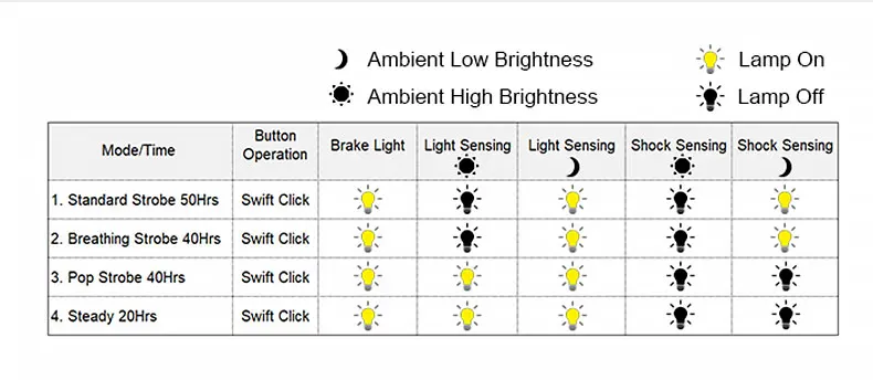 -Первые два режима медленного стробоскопического и дыхательного стробоскопа контролируются индукцией к яркости и удару окружающего светильник. Лампа автоматически включается или выключается в соответствии с яркостью окружающей среды и ударными движениями.