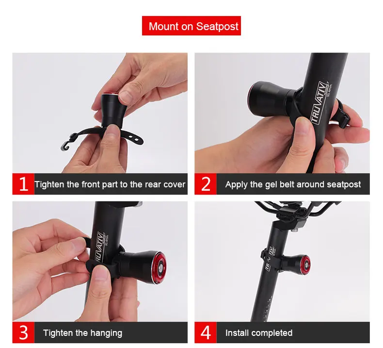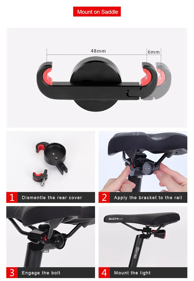 -Q5 имеет 4 режима светильник для удовлетворения различных потребностей езды на велосипеде. Одним нажатием кнопки, чтобы изменить режим: удерживайте медленное дыхание стробебеном, дыхание стробебеном, поп, стробебеном, стабильно выключается.