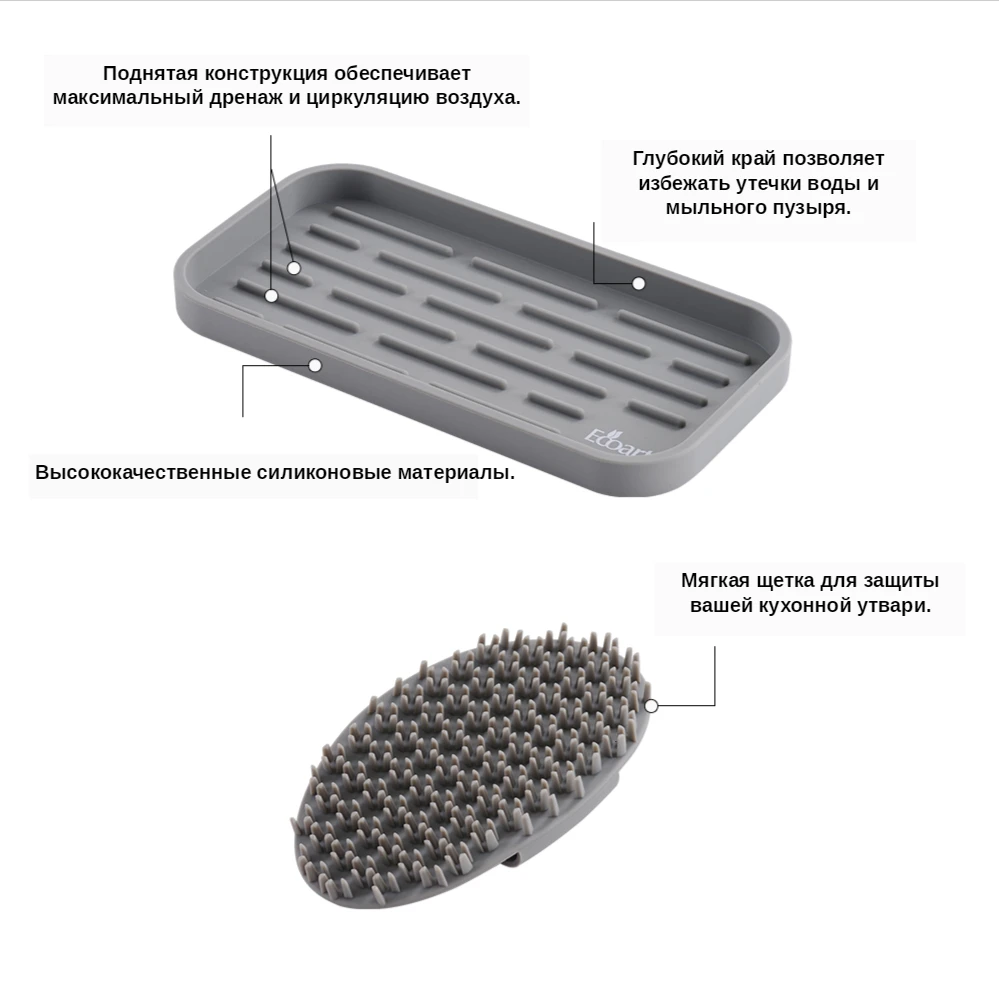 1. Быстрая сушка. Рельефная конструкция обеспечивает максимальный отвод и циркуляцию воздуха. 2. Глубокий край избегает утечки воды и мыльных пузырей. 3. Щетинки щетки для чистки мягкие, чтобы защитить вашу кухонную утварь.