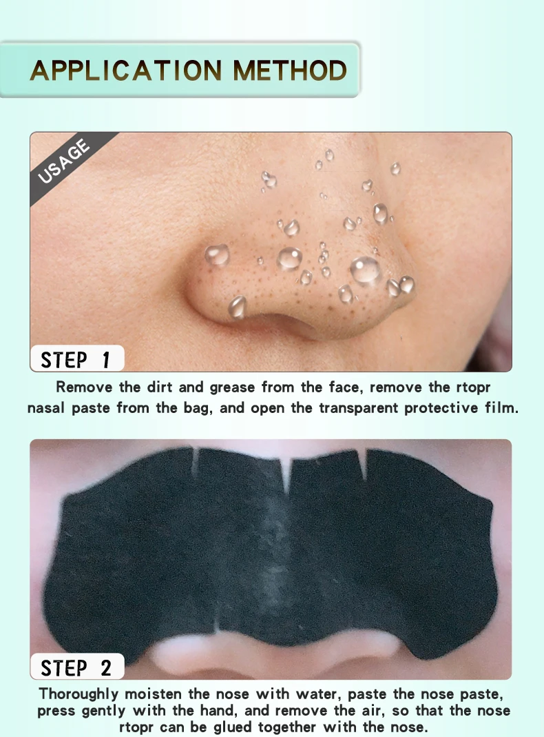 1. Удалите грязь и жир с лица, извлеките из мешка тенасовую пасту и откройте прозрачную защитную пленку. 2. Тщательно смочите нос водой, вставьте ленту, аккуратно нажмите рукой и удалите воздух, чтобы нос можно было склеить вместе с носом. 3. После ожидания 10-15 минут носоупоры тщательно высушиваются и разрываются с обеих сторон носа. 4. Очистите вашу наклеенную кожу.