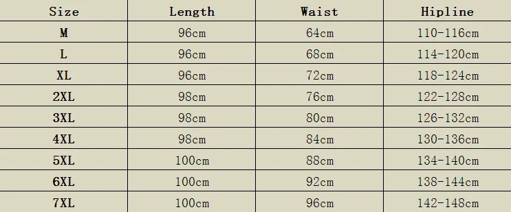 M: Длина: 96 см талия (эластичная):64 см обхват бедер: 110-116 см L: Длина: 96 см талия (эластичная):68 см обхват бедер: 114-120 см XL: Длина: 96 см талия (эластичная):72 см обхват бедер: 118-124 см XXL: длина: 98 см талия (эластичная):76 см обхват бедер: 122-128 см 3XL: длина: 98 см талия (эластичная):80 см обхват бедер: 126-132 см 4XL: длина: 98 см талия (эластичная):84 см обхват бедер: 130-136 см 5XL: длина: 100 см талия (эластичная):88 см обхват бедер: 134-140 см 6XL: длина: 100 см талия (эластичная):92 см обхват бедер: 138-144 см 7XL: длина: 100 см талия (эластичная):96 см обхват бедер: 142-148 см
