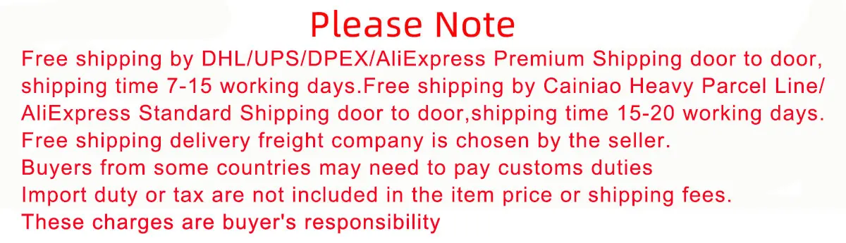 Налоги, таможенные пошлины 1. Импортные пошлины, налоги, НДС или другие скрытые сборы не включены в цены, эти расходы являются обязанностью покупателя; 2. Пожалуйста, свяжитесь с вашей местной таможней или местными налоговыми органами, чтобы узнать подробную пошлину перед покупкой; 3. Мы не несем ответственности за какие-либо таможенные пошлины или налог на импорт, эти сборы не включены в цену товара и стоимость доставки, эти расходы обычно взимаются при доставке грузов (доставка) компании или когда вы выбираете товар-не путайте их за дополнительные расходы по доставке, Некоторые страны не могут быть доставлены бесплатно, пожалуйста, обратите внимание.
