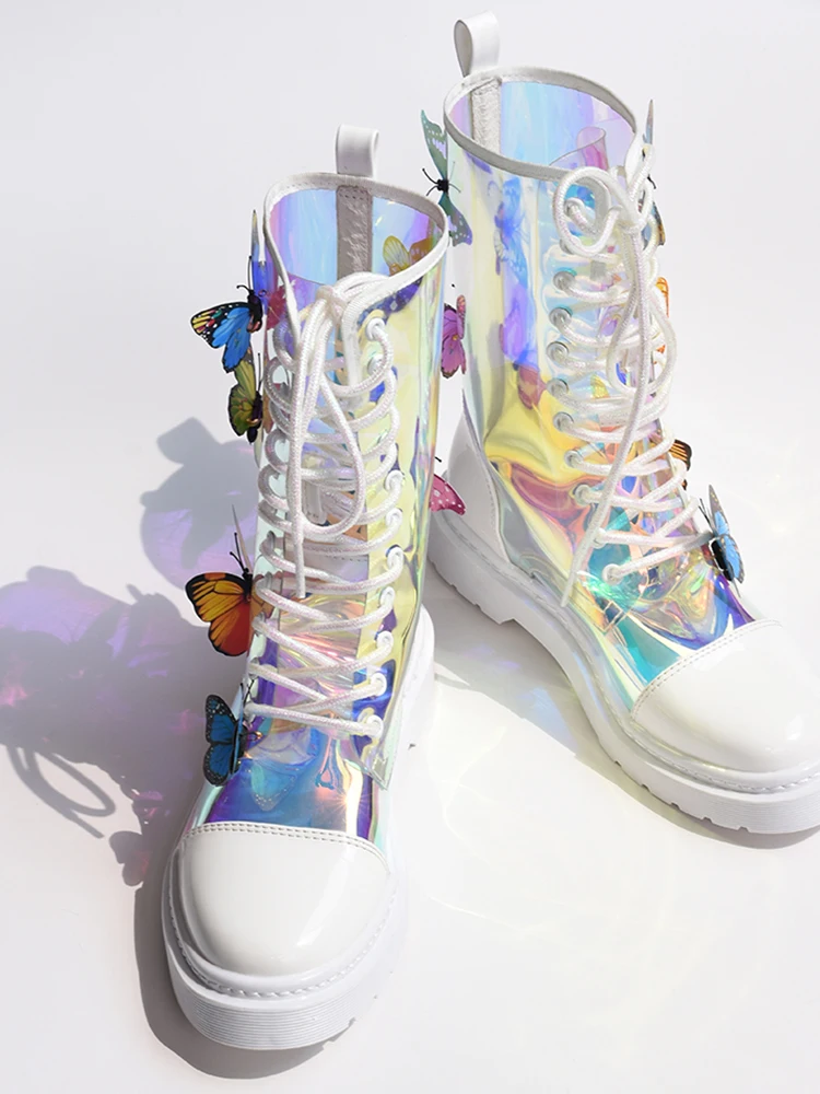Прозрачные женские ботинки из ПВХ с бабочкой; трехмерная обувь на рифленой подошве с кружевом