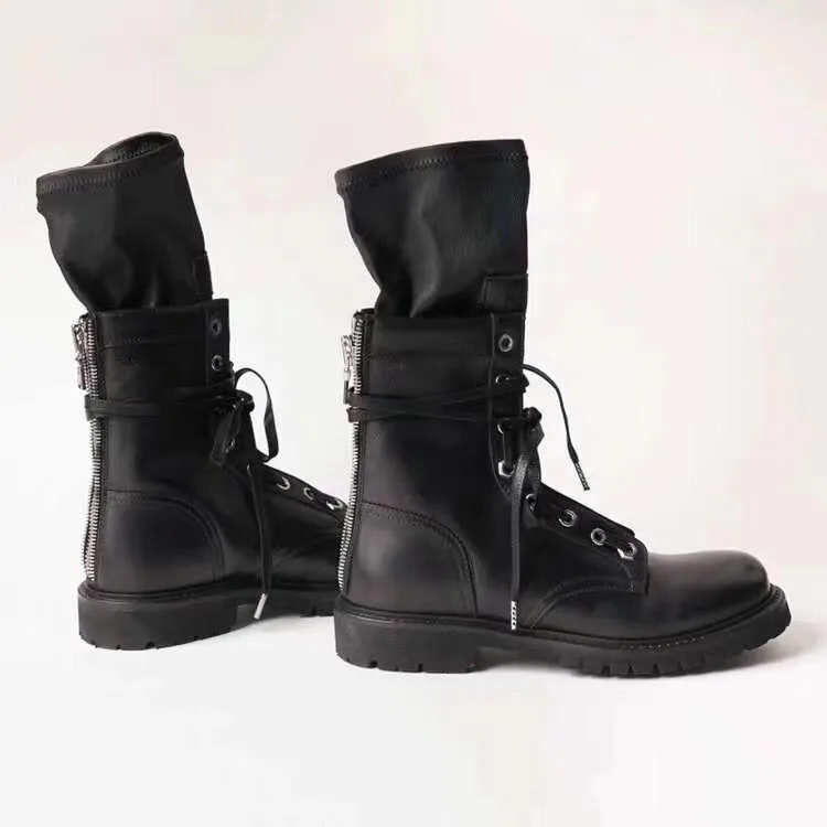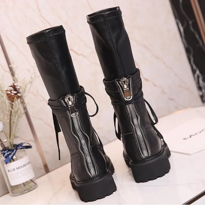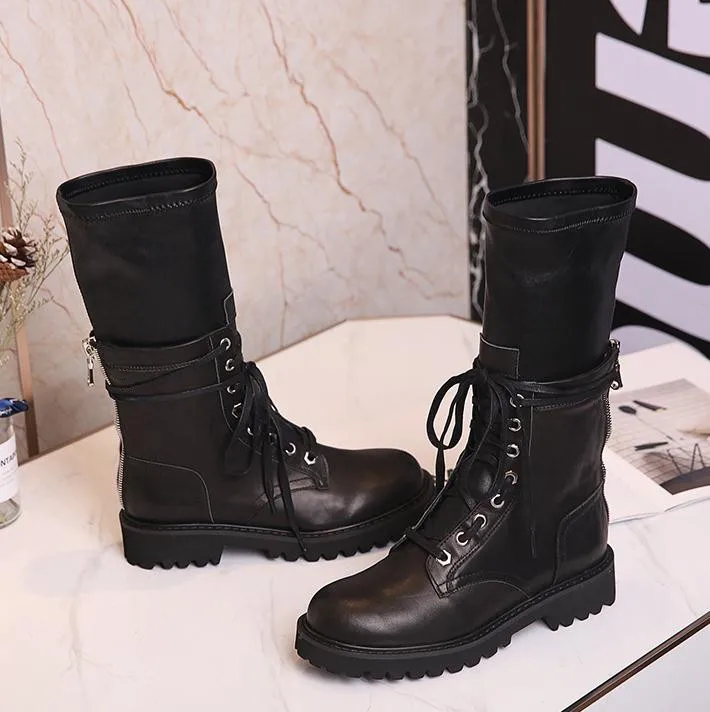 Botas Mujer; осенние носки Армейские сапоги Для женщин кожаный бурдюк Feminina дамские туфли на плоской подошве до середины икры; женские сапоги; Botines Mujer 2019 с волнообразным краем; Zapatos De Mujer