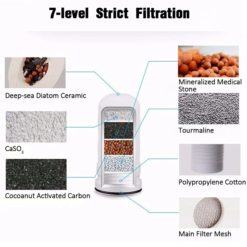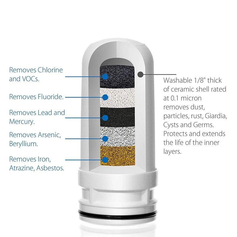 1-й слой: 1/8 дюймовая Толстая керамическая оболочка, рассчитанная на 0,1 микрон, удаляет пыль, частицы, ржавчину, гиардию, кисты и микробы. Защищает и продлевает срок службы внутренних слоев.