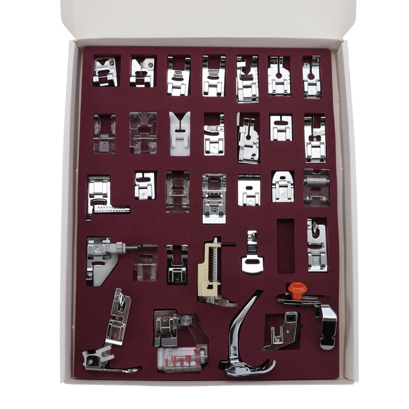 32 ступни лапки, очень практичные. Подходит для большинства бытовых многофункциональных швейных машин. Очень хорошо упакован и легко хранить.