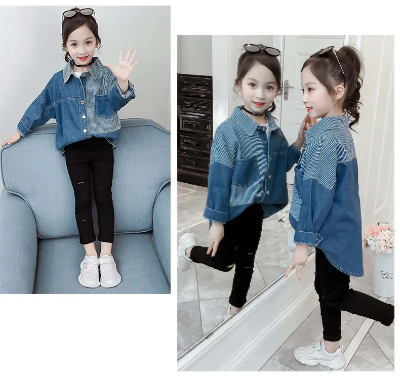 1 полосатая Лоскутная джинсовая рубашка; Одежда для девочек 2 однобортные джинсовые блузки с длинными рукавами Детские асимметричные топы 3 сезона осень 2019 4 осенние рубашки для девочек-подростков; Блузки; Одежда