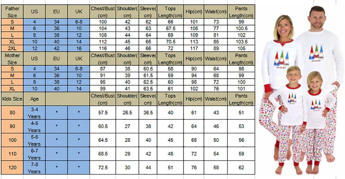 Новейшая модная одинаковая Рождественская Пижама для всей семьи! Высокое качество и абсолютно новый 100% Основной цвет: как на картинке Новинка в моде Материал: 100% хлопокПожалуйста, обратите внимание: если ваш ребенок пухленький, мы рекомендуем выбрать больший размер, спасибо. Просим перепроверять размеры детей, рост и полноту по размерной таблице перед покупкой/подачей заявки. Спасибо за понимание. Посылка включает в себя:1x пижамный комплект Размеры таблицей: