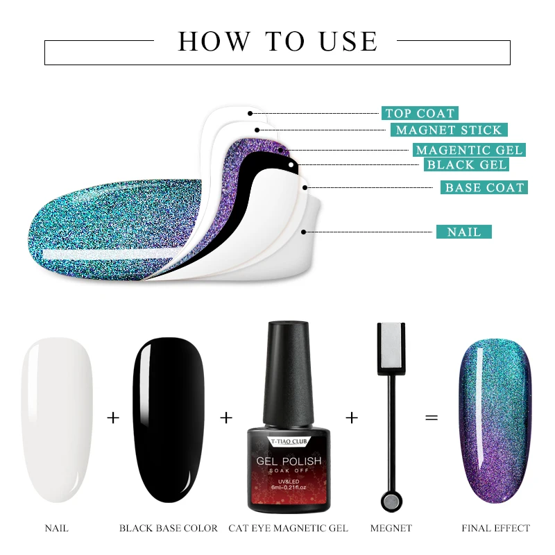 Шаг 6. Нанесите второй слой магнитного УФ-геля, не вылечивайте и положите магнит на ногти на 10-15 секунд, чтобы получить магнитный эффект, А затем немедленно вылечивайте УФ-лампой в течение 2 минут или вылечивайте светодиодной лампой в течение 60 секунд.