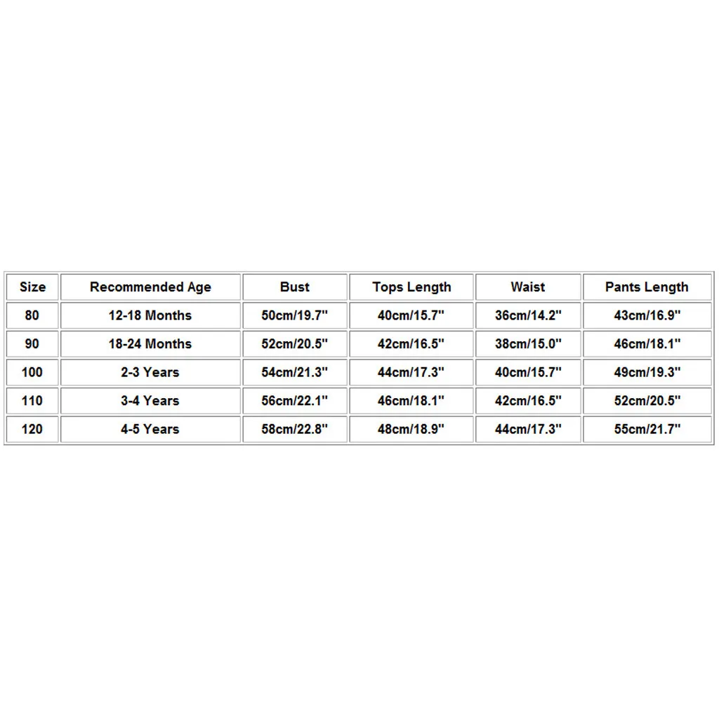 | Размер | Рекомендуемый возраст | Обхват груди | Топы Длина | Обхват талии | Брюки Длина |