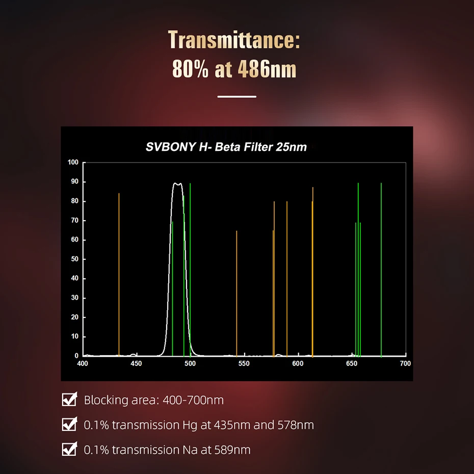 Фильтр H-Beta изготовлен из высококачественного стекла Schott в Германии с многослойным покрытием с ионным покрытием для обеспечения устойчивости к царапинам и стабильности на центральной длине волны, или CWL; Блики и ореолы предотвращаются отражающим покрытием.