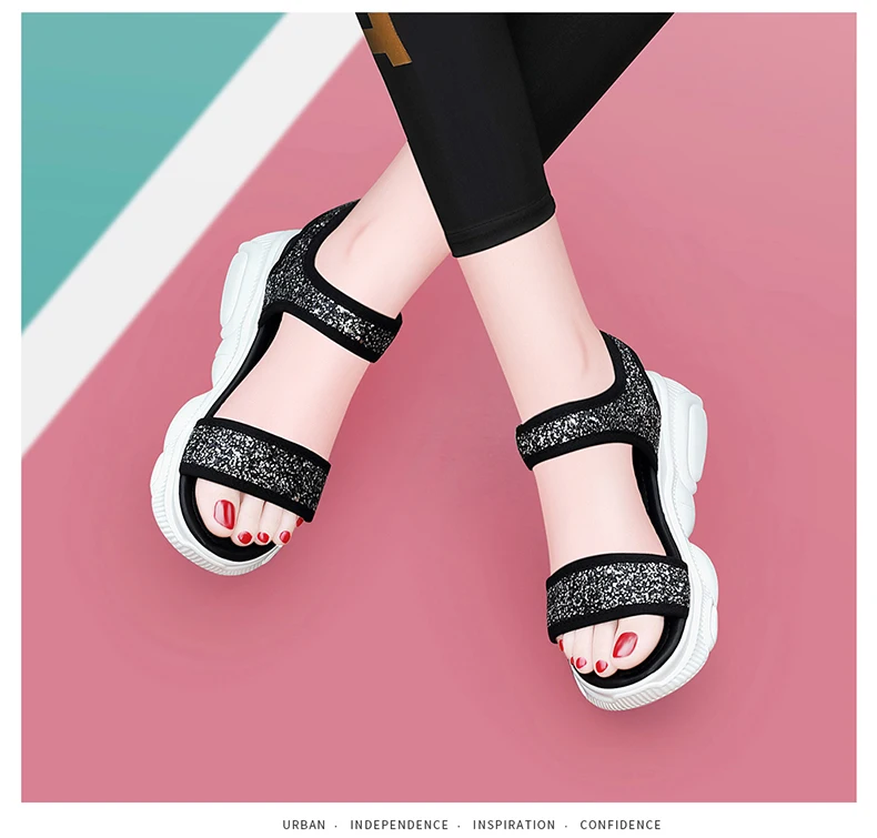 2020 г., новая брендовая повседневная женская обувь с открытым носком на плоской подошве трендовые женские босоножки черного и белого цвета на застежке-липучке с украшением из блестящей ткани Особенности: • 100% новая, высокое качество. • Материал: искусственная кожа • Подошва: из искусственной кожи • Стельки: искусственная кожа; • Высота каблука: 4 см (погрешность-от 1 до 1 см) • Высота платформы: 2,2 см (погрешность-от 1 до 1 см) Проверьте свой размер сейчас! 1. Это американский размер, показанный на AliExpress, а не Британский размер. 2. Пожалуйста, измерьте длину вашей стопы перед покупкой. 3. Например: если длина вашей стопы 22,8 см, пожалуйста, выберите размер 5,5, Размер 5,5 (США) = 36 (EUR) = длина стопы 22,6-23 см