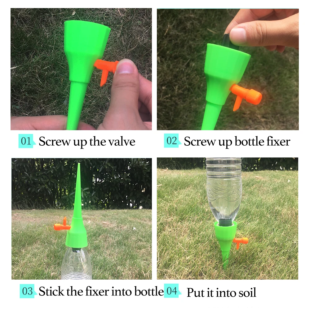 Это устройство легко настроить. Привинтите клапан и фиксатор бутылки, затем поместите устройство в узкое место и зафиксируйте его плотно. Наконец, вставьте устройство в почву, вода будет выходить на платформе, затем медленно капать через клапан.