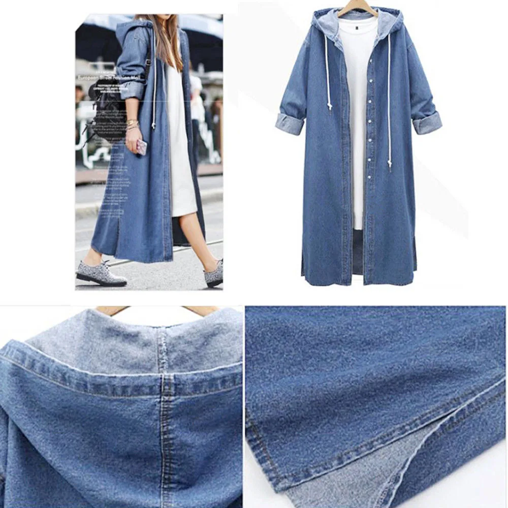 Женская Повседневная джинсовая куртка с капюшоном и длинным рукавом, длинное джинсовое пальто, верхняя одежда