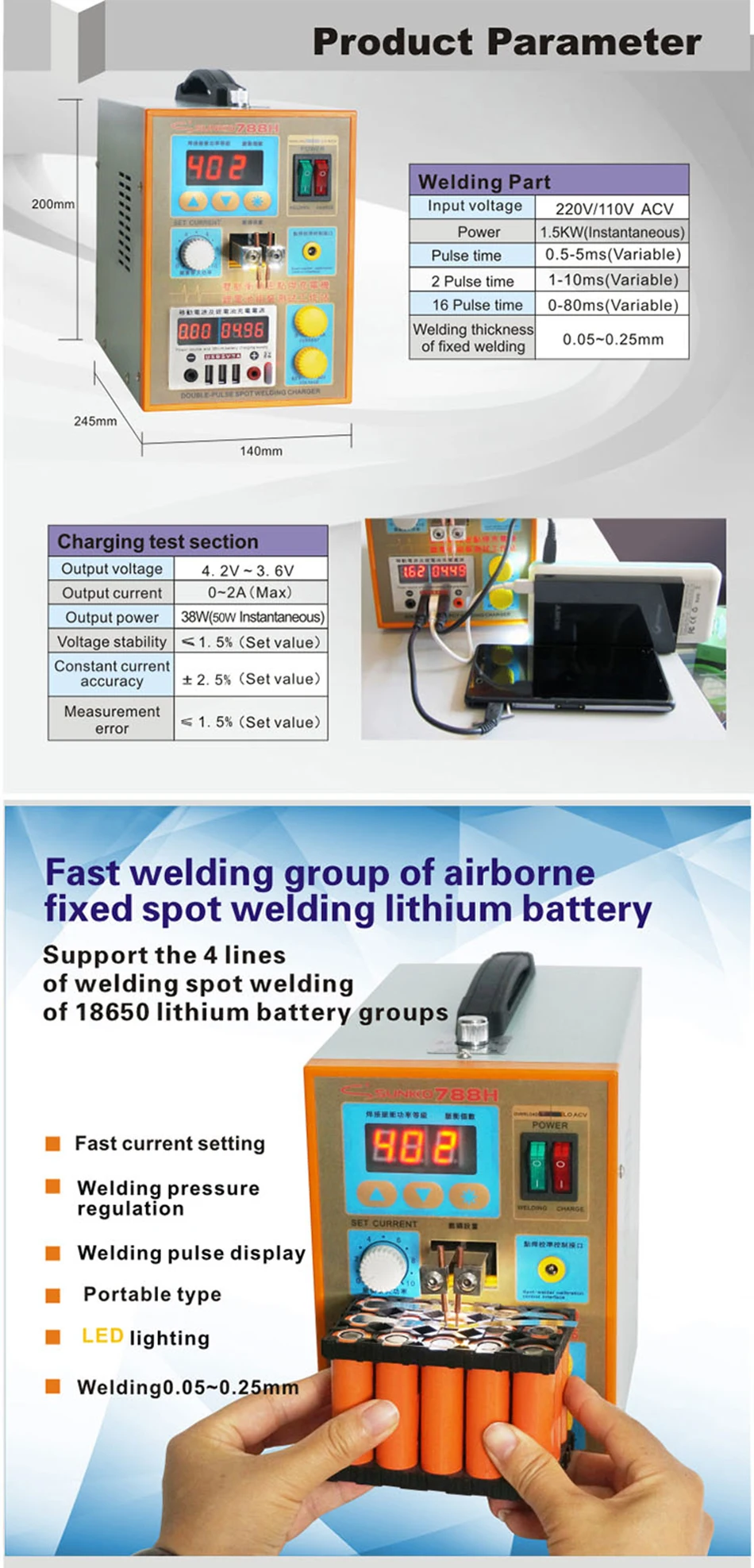 Product parameters Spot welder section Power supply voltage: AC220V / 110V ± 10V% Primary current: 2A~15A Welding current: 50A~800A Welding power: 300g~750g Single pulse welding: 0.05~0.12 mm 16 pulse welding: 0.12~0.25mm Body: 140 × 245 × 200 mm Weight: 5.5 kg Charging and testing power section: Output voltage: 4.2V~36V Output current: 03A (maximum Output power: 38W (50w instantaneous value) Voltage stability: ≤15% (set value) Constant current accuracy: ±25% (set value) Measurement error: ≤15% (set value) Advantage: 1.788H-USB is based on mobile power assembly production, based on the original 788H research and development of products, for mobile power assembly after the test charge aging, test the mobile power supply circuit can work properly, the value of the charge current value. 2.Check whether the circuit board of the mobile power supply is equipped with a charging protection function. 3.788H-USB at the same time to adapt to mobile phones, Tablet PC battery maintenance after the test and aging test. 4.788H-USB has three standard 5V USB output charging port, the maximum output current of 3A, with 2-3A current smart phones, tablet PCs, mobile power and other charging test is very appropriate. Features: 1.Spot welding, lithium battery testing, charging three functions. 2.Microcomputer control 199 (99 * 1; 99 * 2) precision welding parameter setting. 3.Ultra-fast welding selection mode with single pulse and double pulse. 4.Both the knob-type quick-setting pulse group (16-pulse) high-current slow welding mode, suitable for thicker nickelplate welding. 5.With 4.2V-36V 3A adjustable constant voltage constant current charging device to meet most of the lithium battery after welding charge or test. 6.Unique battery tester can test the lithium battery charging current. 7.With pedal welding trigger switch, improve welding quality. 8.Professional welding of the needle pressure regulator device.