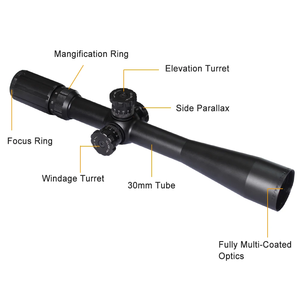 Увеличение: 6-24X Диаметр объектива: 44 мм, параллельная установка 10yds. До Бесконечности FOV@100yds.16.7-4.2ft Тактический Башни сторона регулировка параллакса зрачка: 3,5 ''диаметр трубки: 30 мм