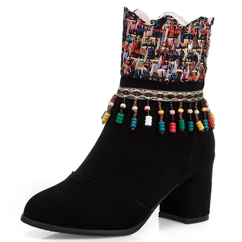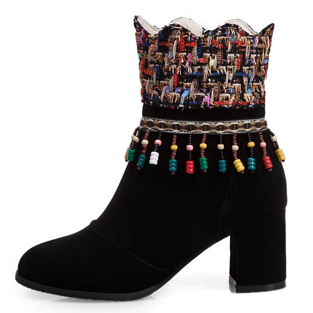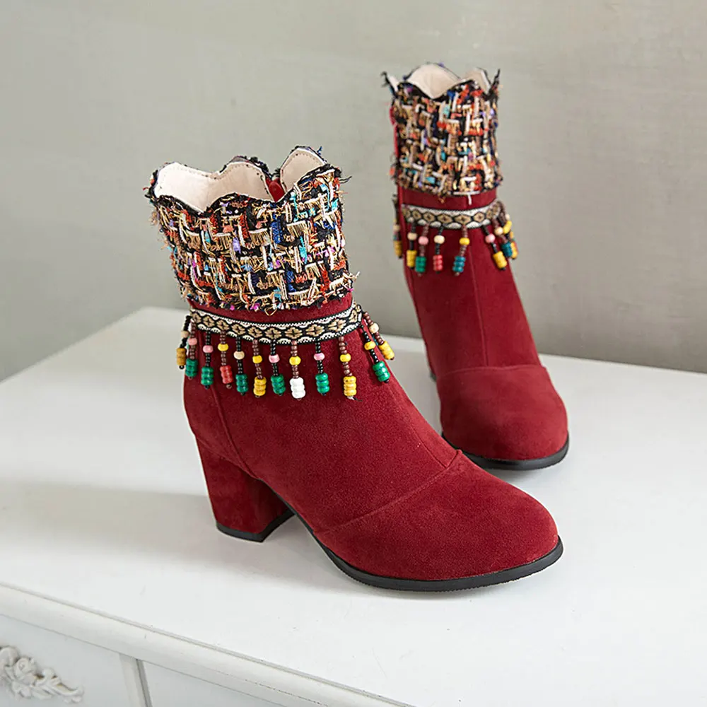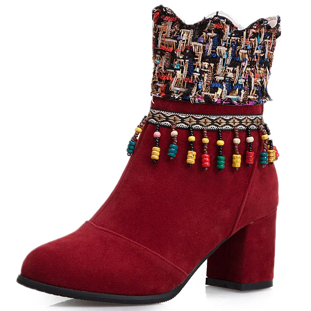 Зимние сапоги Для женщин из флока черный, красный с прямым валиковым швом; с бахромой плед до голени на высоком блочном каблуке, Для женщин обувь, сапоги, обувь, размер 34-50
