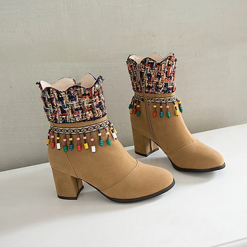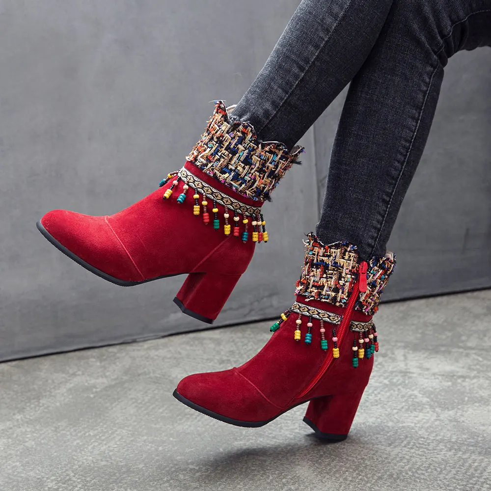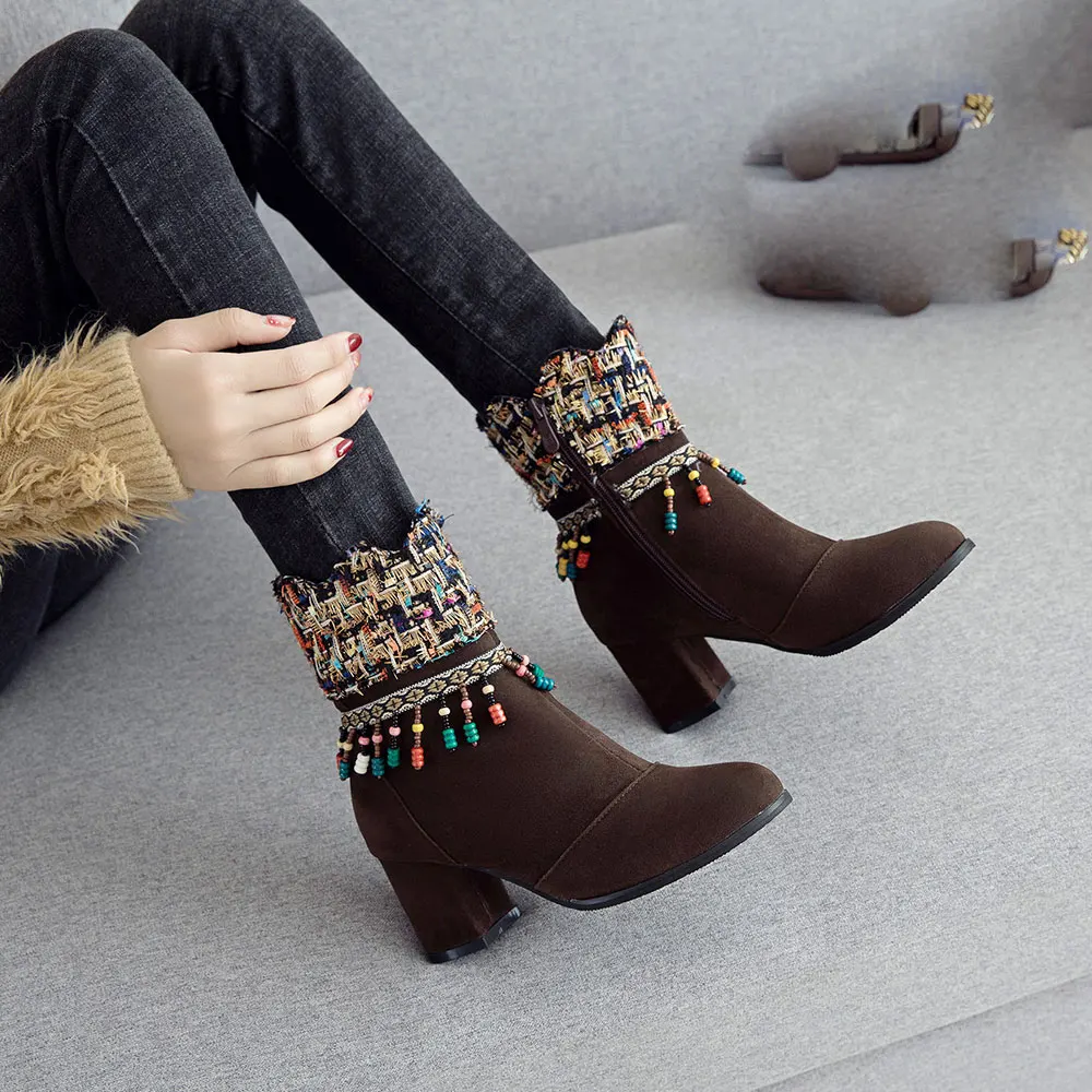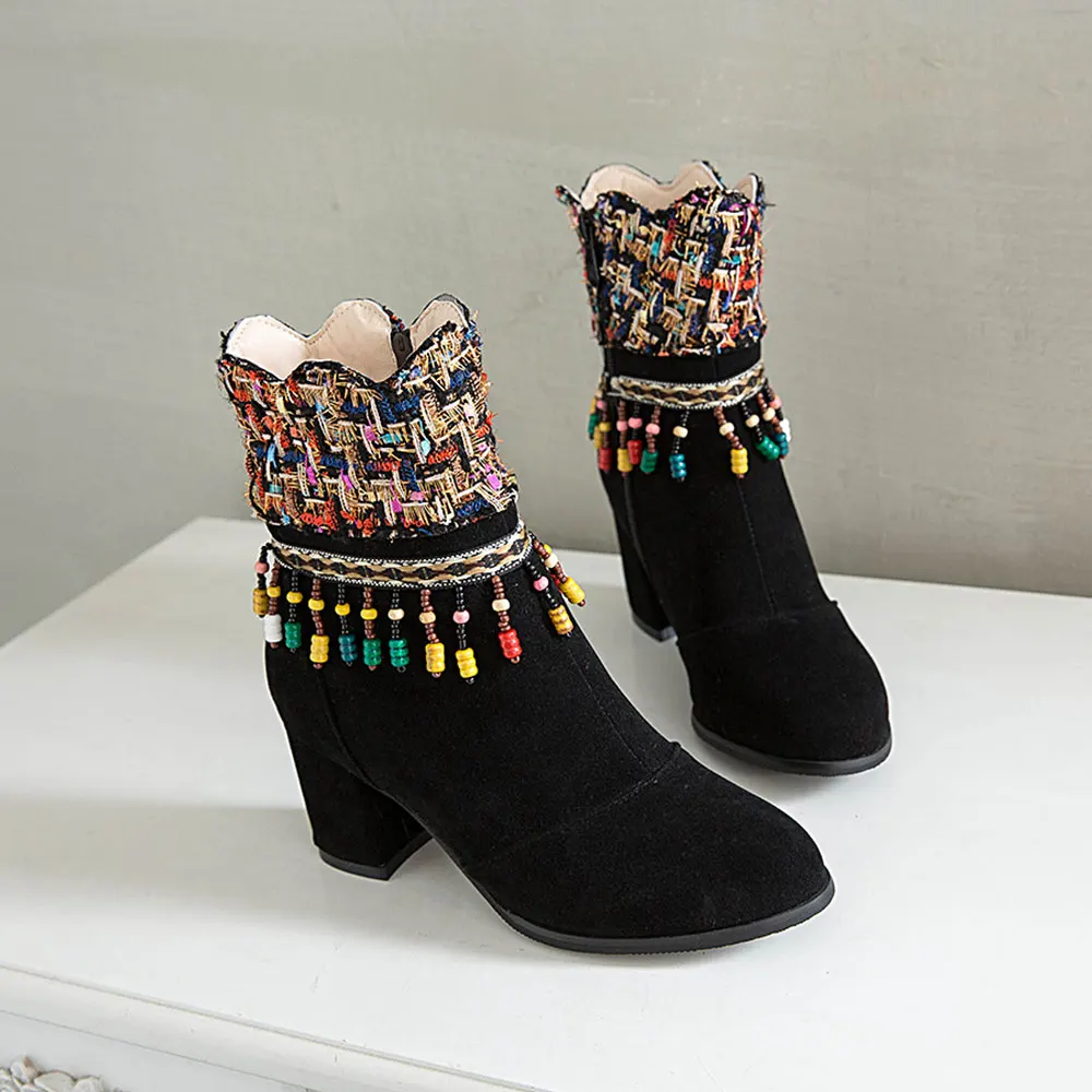 Зимние сапоги Для женщин из флока черный, красный с прямым валиковым швом; с бахромой плед до голени на высоком блочном каблуке, Для женщин обувь, сапоги, обувь, размер 34-50