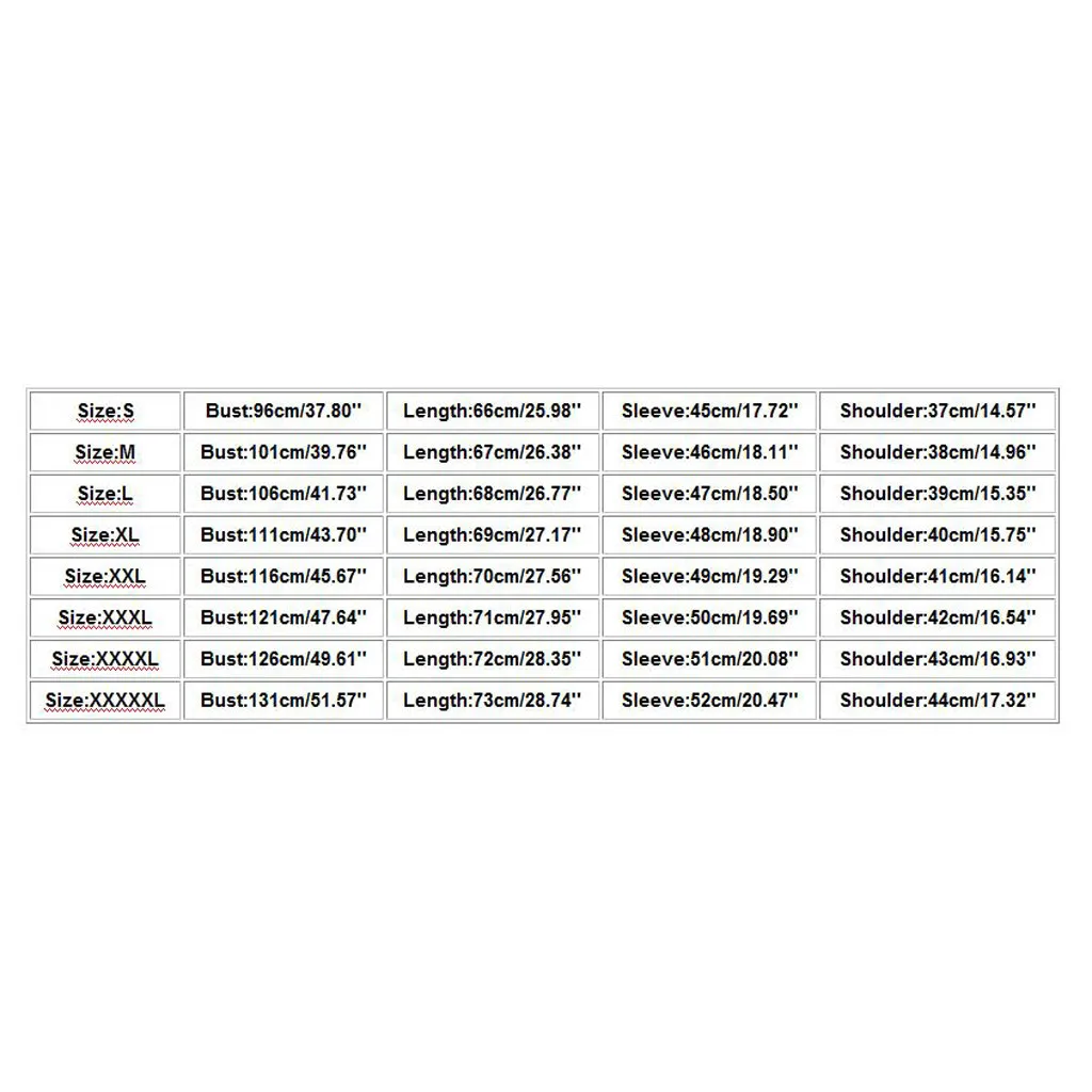 Size:S Bust:96cm/37.80'' Length:66cm/25.98'' Sleeve:45cm/17.72'' Shoulder:37cm/14.57'' Size:M Bust:101cm/39.76'' Length:67cm/26.38'' Sleeve:46cm/18.11'' Shoulder:38cm/14.96'' Size:L Bust:106cm/41.73'' Length:68cm/26.77'' Sleeve:47cm/18.50'' Shoulder:39cm/15.35'' Size:XL Bust:111cm/43.70'' Length:69cm/27.17'' Sleeve:48cm/18.90'' Shoulder:40cm/15.75'' Size:XXL Bust:116cm/45.67'' Length:70cm/27.56'' Sleeve:49cm/19.29'' Shoulder:41cm/16.14'' Size:XXXL Bust:121cm/47.64'' Length:71cm/27.95'' Sleeve:50cm/19.69'' Shoulder:42cm/16.54'' Size:XXXXL Bust:126cm/49.61'' Length:72cm/28.35'' Sleeve:51cm/20.08'' Shoulder:43cm/16.93'' Size:XXXXXL Bust:131cm/51.57'' Length:73cm/28.74'' Sleeve:52cm/20.47'' Shoulder:44cm/17.32''