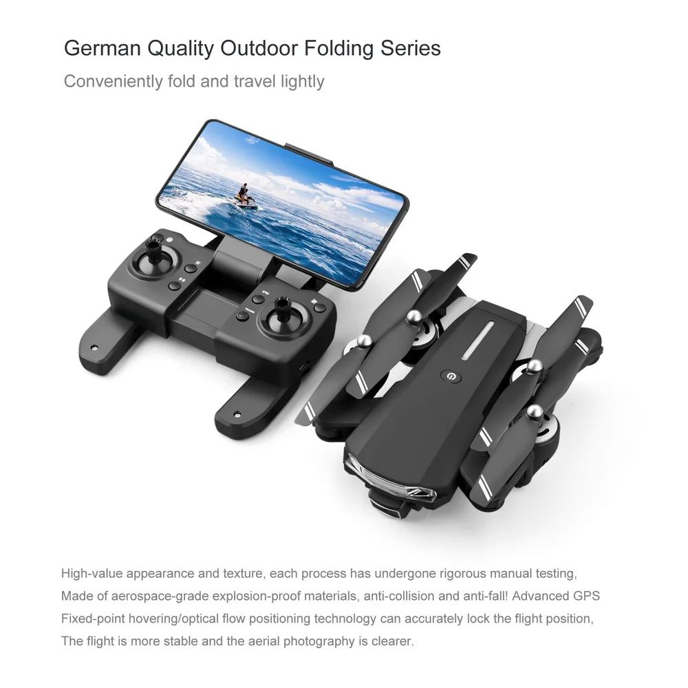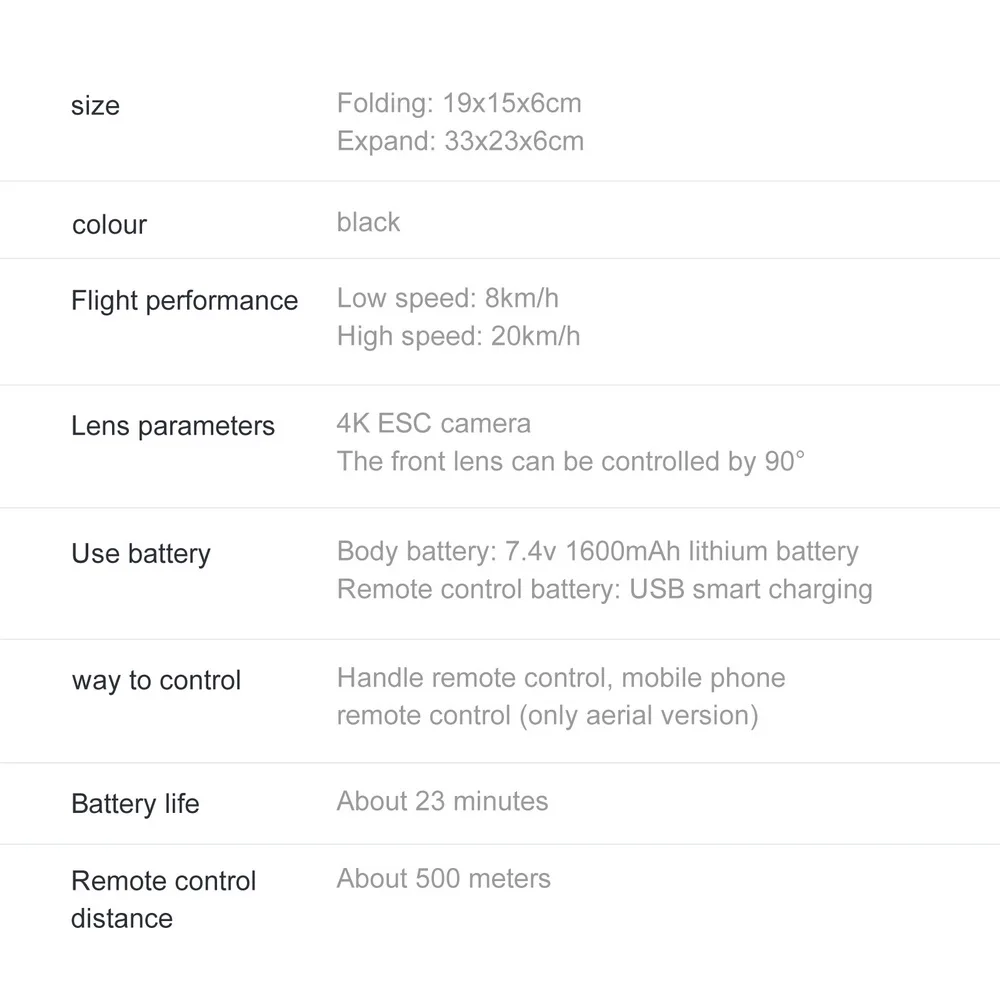 Основные функции: подъем/спуск, вперед/назад, влево/вправо, влево/вправо, Взлет/посадка одной кнопкой, Безголовый режим, возврат одной кнопкой, 3D рулон, переключение скорости, позиционирование GPS, низкое энергопотребление автоматическое возвращение, оптическое позиционирование потока