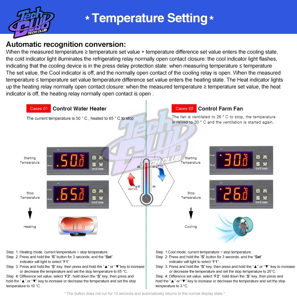 Описание: Название продукта: регулятор температуры Модель продукта: DST1000 Напряжение питания: AC110 ~ 220 В Диапазон температур: -50 ~ + 120 °C Температура Точность измерения: ± 0,5 °C (в диапазоне от-10 до + 85 °C) Длина линии: 1 м Размер: 75 мм * 85 мм * 35 мм Подходящая сцена: различные коробки управления датчиком, водонагреватель, морозильник, вентилятор (Не ограничиваются устройствами) Настройка температуры: Настройка режима нагрева и охлаждения Настройка (начальная температура): Пресс и удерживайте the▲button 3 секунд, чтобы начать, если вы хотите использовать Температура мигает, Use▲▼button, чтобы установить начало Температура соотношение цена/качество Настройка (температура остановки): Пресс и удерживайте the▼button кнопку в течение 3-х секунд, чтобы остановить Температура мигает, Use▲▼button установить единый Температура соотношение цена/качество Чехлы 01 управления водонагревателем: Нагрев до 65 °, чтобы остановить, температура падает до 50 ° и нагревается снова Шаг 1: режим нагрева, начальная температура <температура остановки. Step2: Пресс и удерживайте the▲button 3 секунд, чтобы начать, если вы хотите использовать Температура значение мигать. Use▼ ▼ для установки начальной температуры до 50 °. Шаг 3: Нажмите и удерживайте кнопку the3 секунды, чтобы остановить мигание значения температуры. Use▼ set для установки температуры стоп до 65 ° и установка завершена. Кнопка не работает в течение 5 секунд и автоматически возвращается в нормальное состояние дисплея. Чехлы 02 управляемый вентилятор фермы: Вентилятор проветривается до 26 ° для остановки, температура поднимается до 30 °, и вентиляция начинается снова. Шаг 1: режим охлаждения, температура запуска> Температура остановки. Step2: Пресс и удерживайте the▲button 3 секунд, чтобы начать, если вы хотите использовать Температура значение мигать. Use▼ ▼ для установки начальной температуры до 30 °. Шаг 3: Нажмите и удерживайте кнопку the3 секунды, чтобы остановить мигание значения температуры. Use▼ set, чтобы установить температуру остановки до 26 °, и установка завершена. Кнопка не работает в течение 5 секунд и автоматически возвращается в нормальное состояние дисплея. Посылка включает: Цифровой термостат DST1000-1 шт.