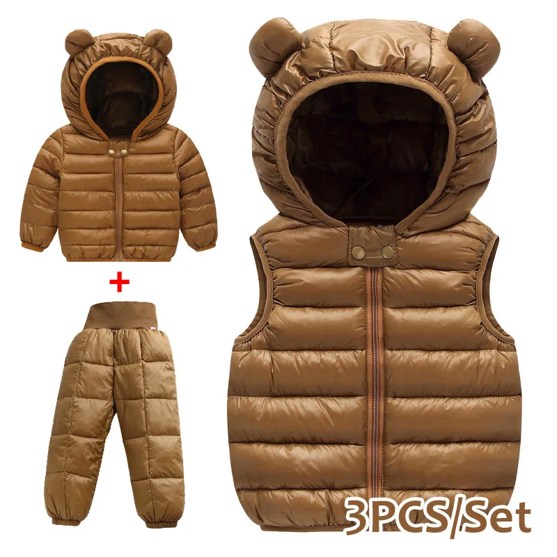 Детская пуховая хлопковая одежда 3 предмета (куртка + штаны + жилет), зимнее пальто для девочек Коричневое Пальто с капюшоном для мальчиков верхняя одежда для малышей, зимние штаны