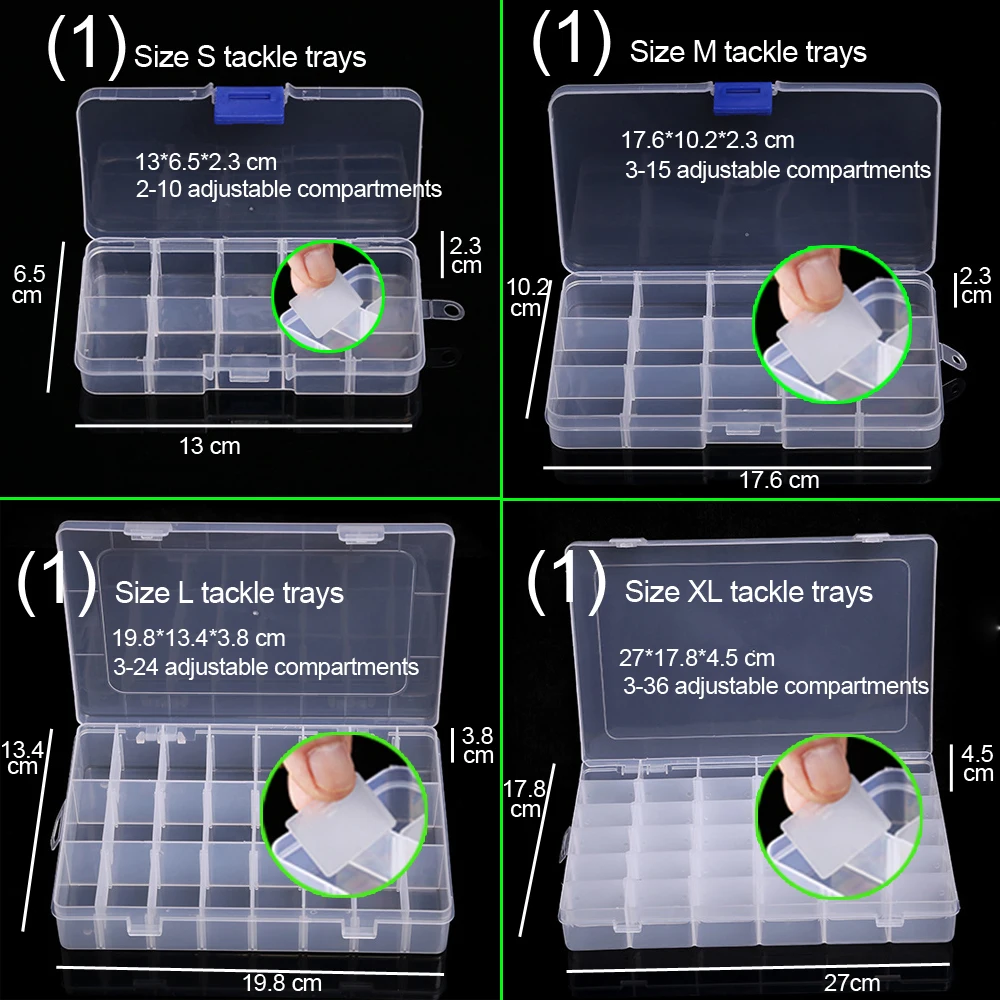 there are 4 size, trays size XL: 27.6*17.8*4.5cm (3600) trays size L: 19.8*13.4*3.8cm trays sizeM: 17.6*10.2*2.3cm trays size S: 13*6.5*2.3cm The adjustable dividers provide the flexibility to load your utility case with plastic baits, terminal tackle, nuts, bolts, screws, beads, wire, spools of thread, or just about any small item.