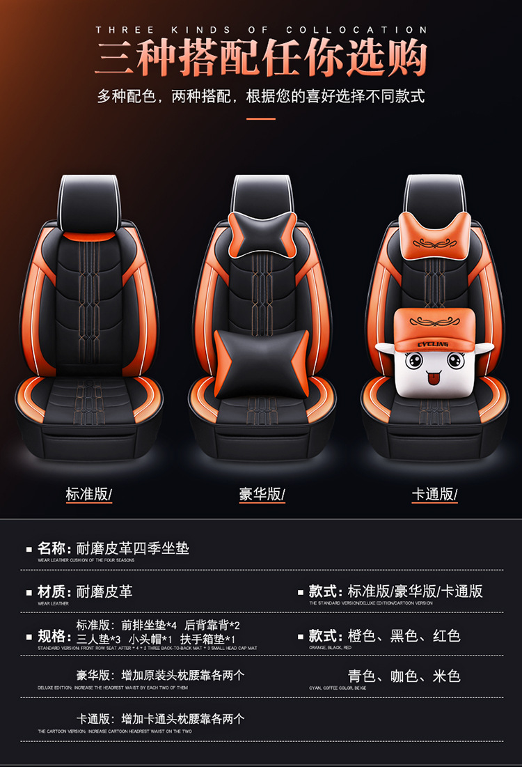 Материал: Высококачественная кожа (ПУ) Применимые модели: Универсальные (за исключением специальных моделей) Места для сидения: 5 мест Посылка: Стандартное издание: 5 сидений, без подголовников, без поясничной поддержки. Роскошная версия: 5 сидений, 2 обычных подголовника + 2 обычных поясничных отделения. Версия с героями мультфильмов: 5 сидений, 2 подголовника с героями мультфильмов + 2 поясничных отделения с героями мультфильмов.