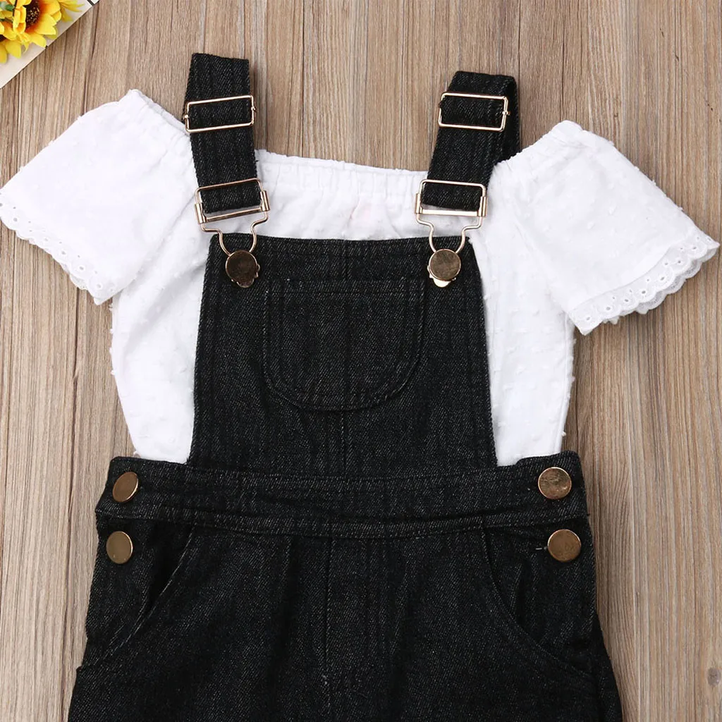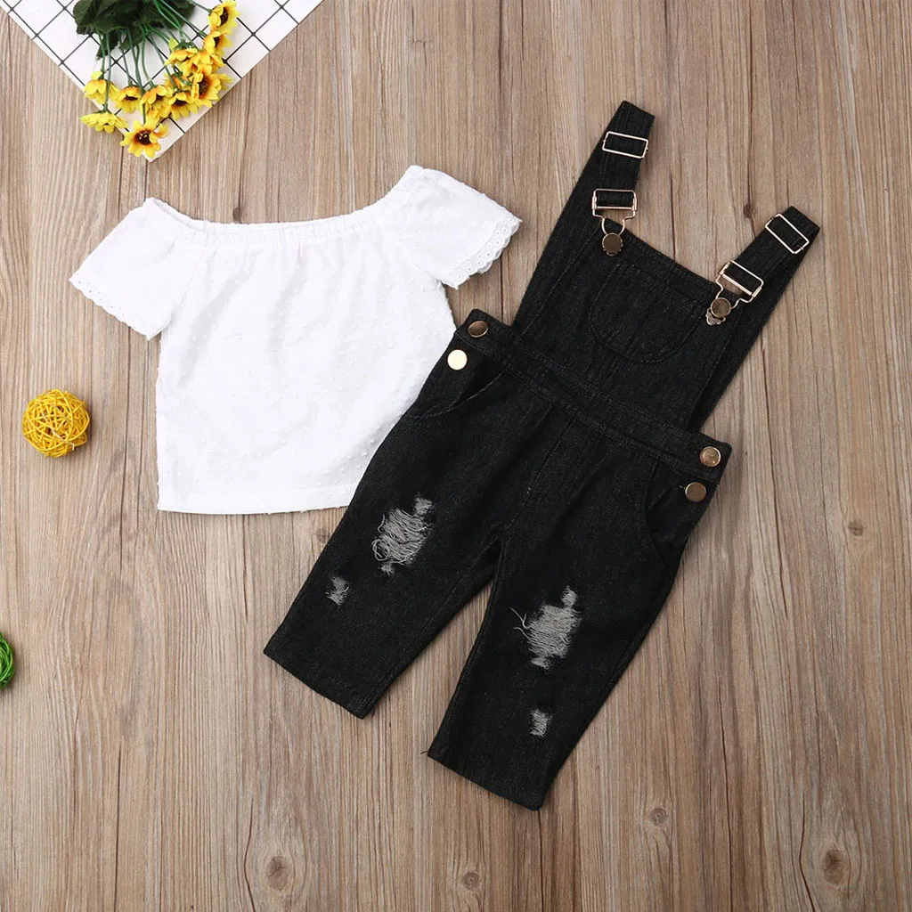 Комплект одежды для маленьких девочек: топ с открытыми плечами + джинсовые штаны на подтяжках