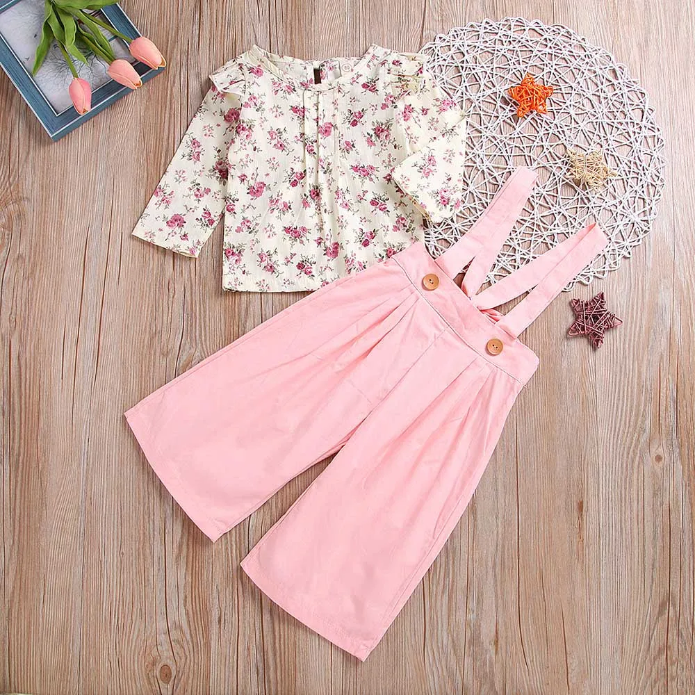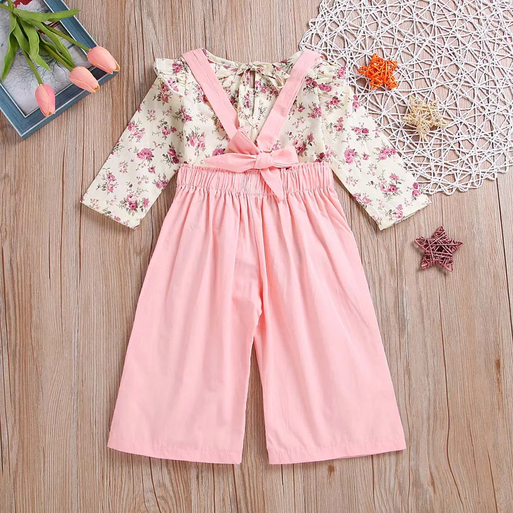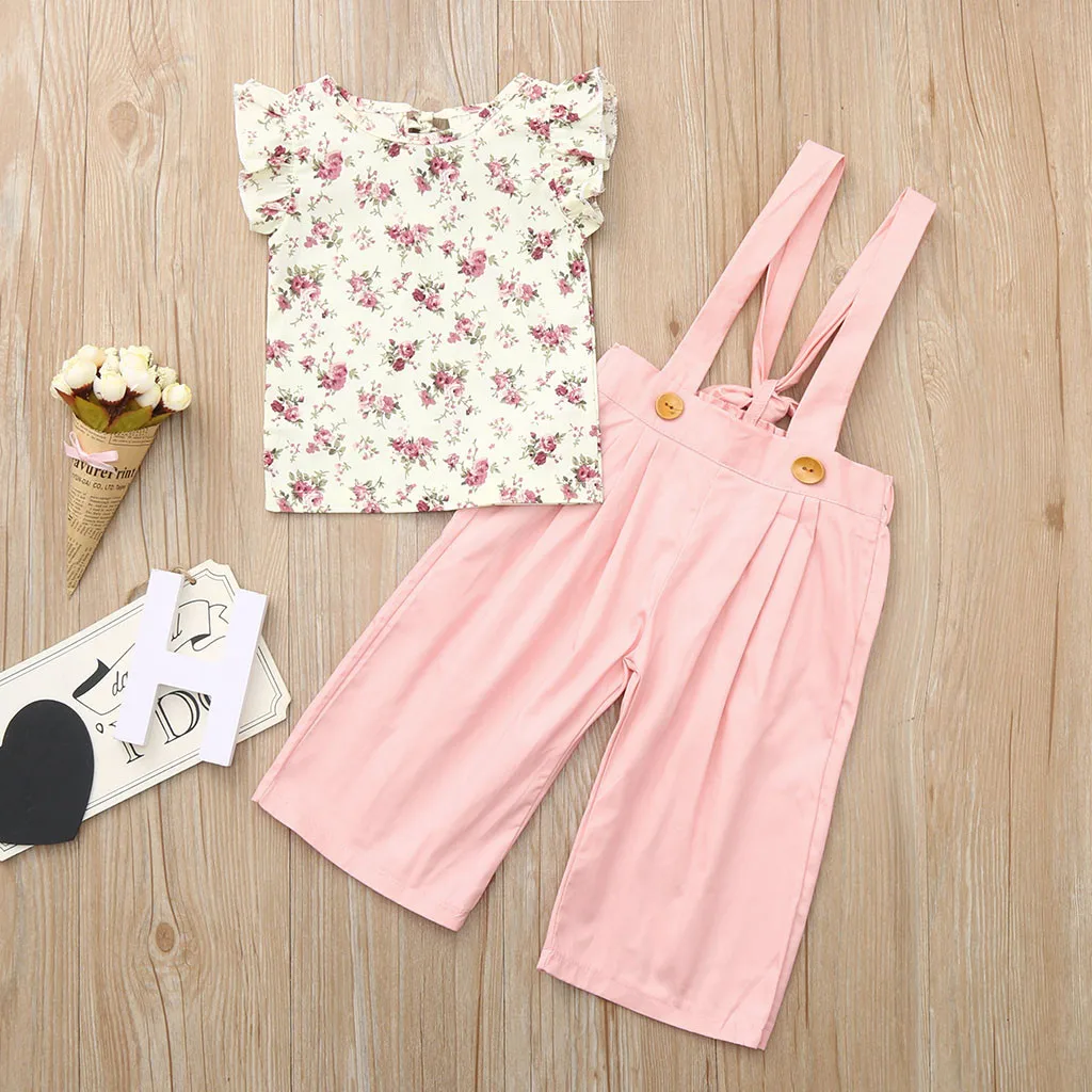 Toddler Baby Girls Sleeveless Floral Tops+Solid Overalls Pants Clothes Outfits