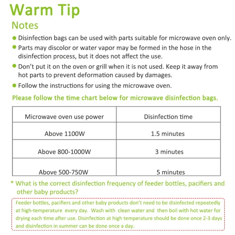 Когда вы находитесь дома или на улице, вы можете заполнить паровой пакет водой, поместите продукты для кормления, такие как аксессуары для грудного вскармливания или бутылочки для кормления, и поместите их в микроволновую печь для дезинфекции. Вам больше не нужно кипятить воду этим продуктом. Удобный и эффективный, безопасный и гигиеничный.