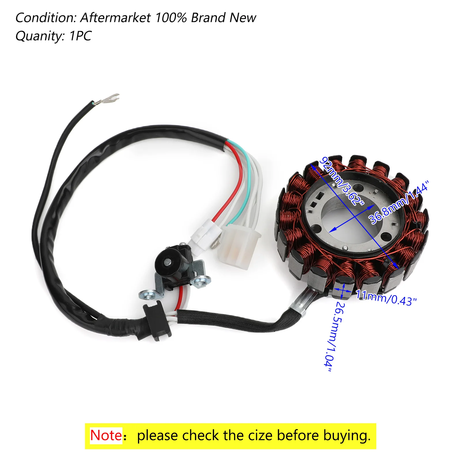 Катушка статора двигателя магнето для Yamaha YB125 YB125SPD YBR125ED 3D9/51D 2008-2014 Особенности: Прямая замена на ваш оригинальный блок Plug-and-play, прямой крой, простая установка. Ламинационные материалы высшего качества. Высококачественные медные обмотки, устойчивы к 200 градусам Цельсия. В комплект входит катушка pulsar. В комплект входит коннектор. Все товары проходят проверку. Характеристики: Состояние: Aftermarket 100% Новый бренд Quanity: 1 шт. Тип: катушка генератора статора Номер запасной части: 3D9-H1410-10, 3D9-H1410-12 Размеры: Внутренний диаметр: 36,8 мм/1,44" Внешний диаметр: 92 мм/3,62" Полюса Толщина: 26,5 мм/1,04" Ширина полюса: 11 мм/0,43" Другие характеристики: Количество проводов: 6 Количество контактов: 6 Количество вилок: 3 Количество отверстий для фиксации: 3 Количество полюсов: 18 Приспособление: Для Yamaha YB125 YB125SPD 2008 Для Yamaha YBR125ED/3D9 2008-2014 Для Yamaha YBR125ED/51D 2012 Посылка включает в себя: 1x генератор статора катушки Примечание: Перед установкой нового статора Проверьте выход переменного тока статора. Замените любые сгоревшие или коррозионные разъемы на статоре и регуляторе/выпрямителе. Проверьте и отремонтируйте любую расплавленную проводку. Используйте диэлектрическую смазку высокой температуры на всех коннекторах Наш статор может использовать другой цветовой код провода, чем ваш оригинал. Все провода установлены в правильном порядке; Пожалуйста, не меняйте конфигурации проводов. Этот статор предназначен для прямой замены и должен использоваться как таковой. При закреплении статора всегда используйте блокирующее соединение. Если наш статор включает в себя катушку пикапа, всегда убедитесь, что воздушный зазор верен при установке. Все фотографии товара являются точными; Если вы сомневаетесь, сравните наш товар с вашей оригинальной частью.