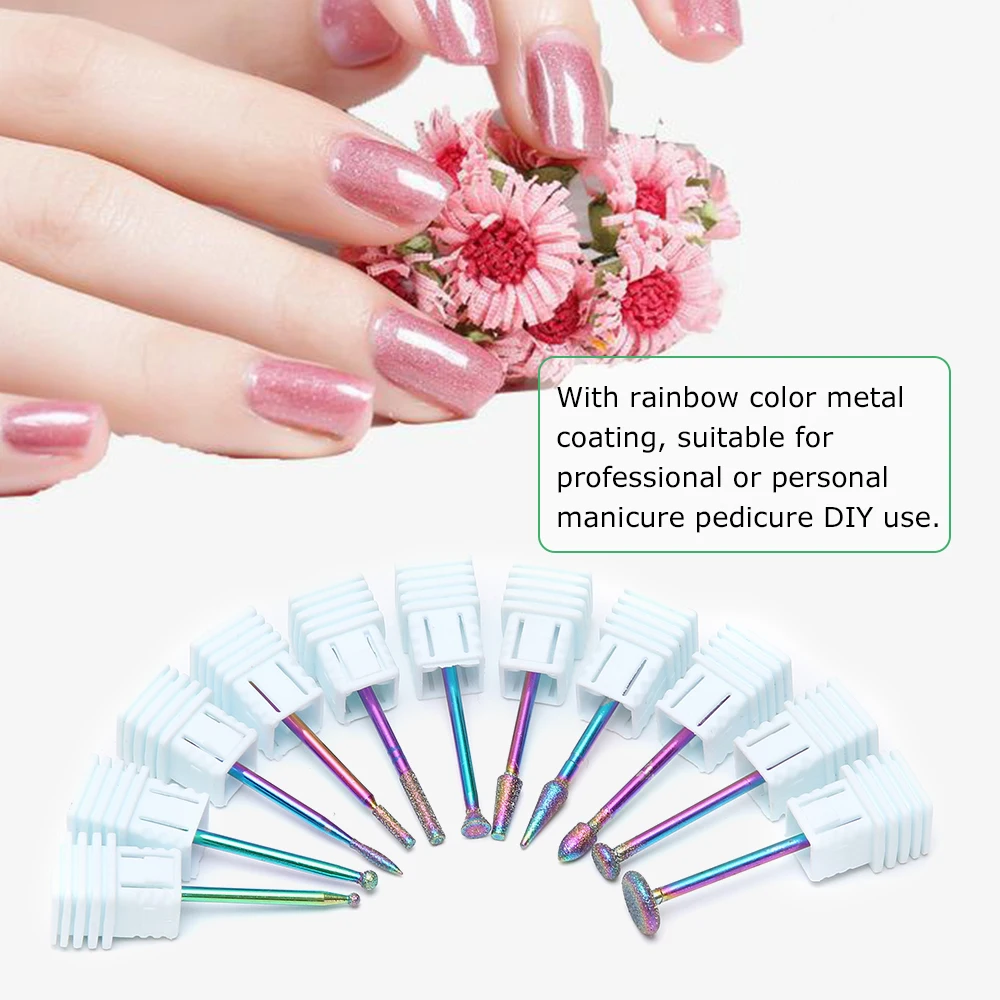 Сверла для ногтей используются для заточки, шлифования, очистки, резьбы, сглаживания, полировки и изменения формы акриловых ногтей. С металлическим покрытием цвета радуги, подходит для профессионального или личного маникюра и педикюра DIY.