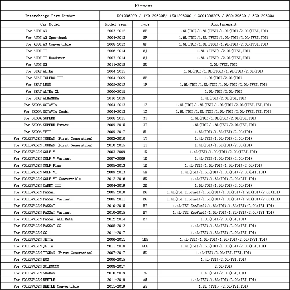 Для Audi A3 8P 2003 2004 2005 2006 2007 2008 2009 2010 2011 2012 1.6L(TDI) 1.8L(TFSI) 1.9L(TDI) 2.0L(TFSI,TDI)