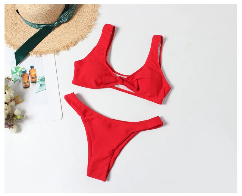 Сексуальный треугольный комплект бикини с бантом, Женский однотонный купальный костюм, купальник, летняя пляжная одежда, женский красный купальник с низкой талией, бикини