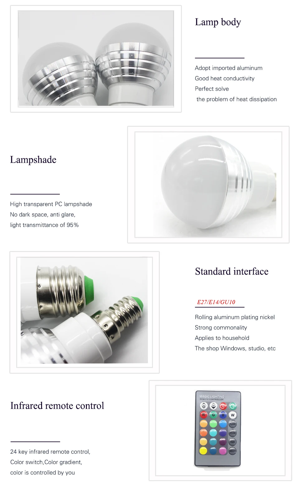 Базовый тип: E27 E14 GU10 Мощность: 5 Вт Вход: 85-265 В переменного тока Светильник: красный, зеленый, синий, белый, оранжевый и так далее (всего 16 видов цветов) Батарея дистанционного управления: 1 х батарейка CR2025 (батарея не входит в комплект) Корпус: Высокопрочный алюминий Размер лампы: 60x127 мм (DxL) Светодиодный чип на плате) Срок службы:> 50000 часов Температура тела: <60 °C Светодиодный температурный режим работы: <65 °C Гарантия: 3 года Утверждения: CE/RoHS Подходит для освещения и украшения дома/вечерние/и т. Д.