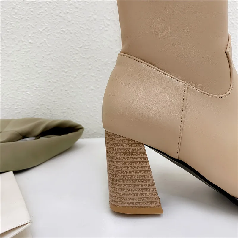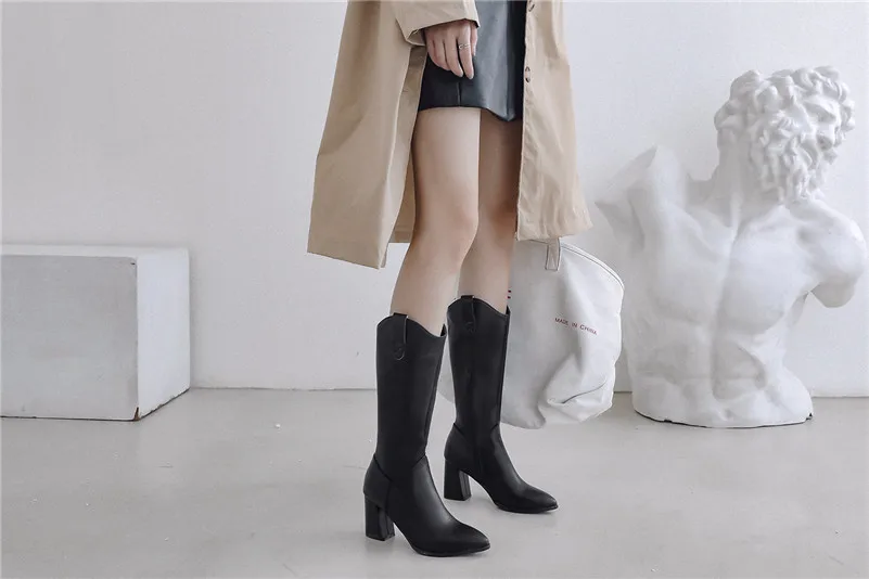 ANNYMOLI/Осенние Сапоги в западном стиле женские сапоги до колена на молнии, на высоком квадратном каблуке высокие ботинки с острым носком женские зимние сапоги, большие размеры 3-12