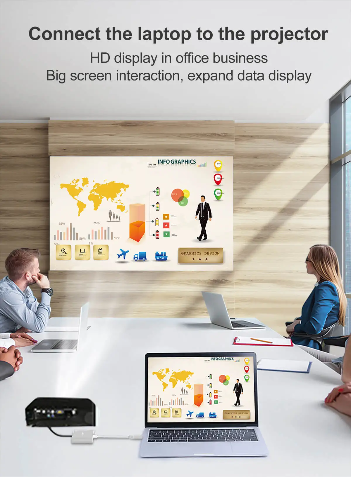 【Двойной выход 】 аудио-и видеосигналы с ПК, оснащенного usb-разъемом Type-C, могут одновременно выводиться на дисплей, телевизор, проектор и т. д., оснащенный входным терминалом HDMI или VGA.