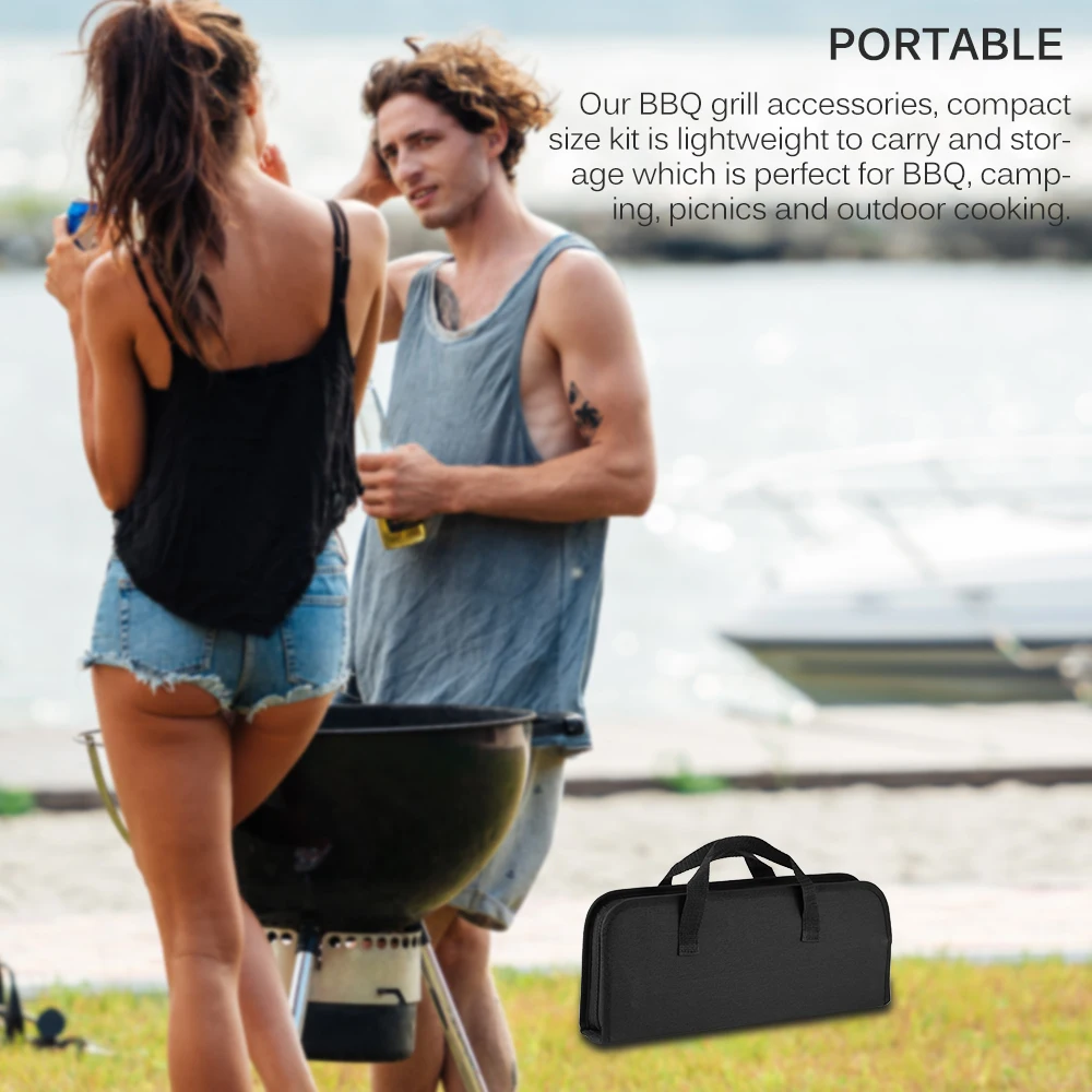 Наши принадлежности для гриля для барбекю, компактный размер набора легкий для переноски и хранения, который идеально подходит для барбекю, кемпинга, пикников и приготовления пищи на открытом воздухе.