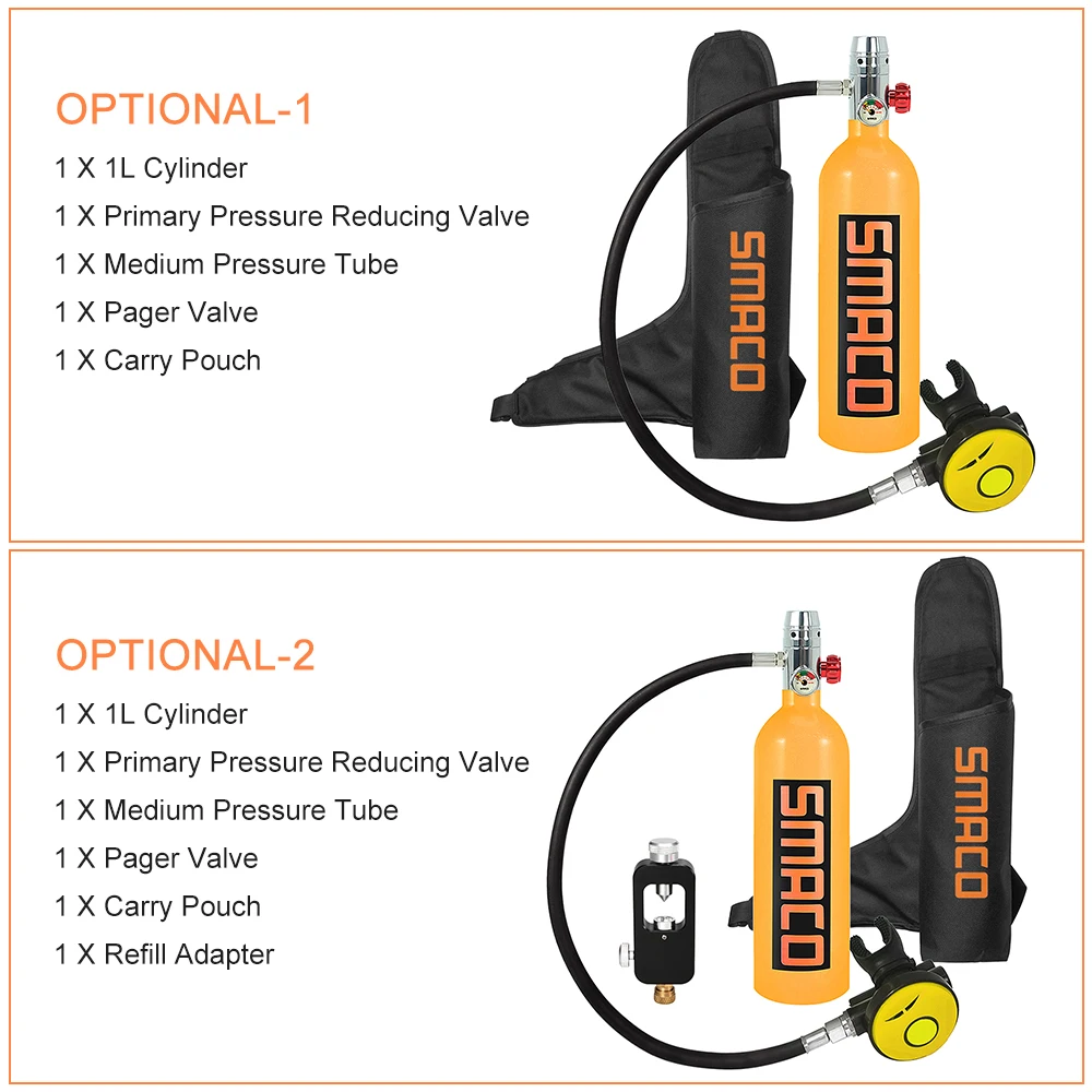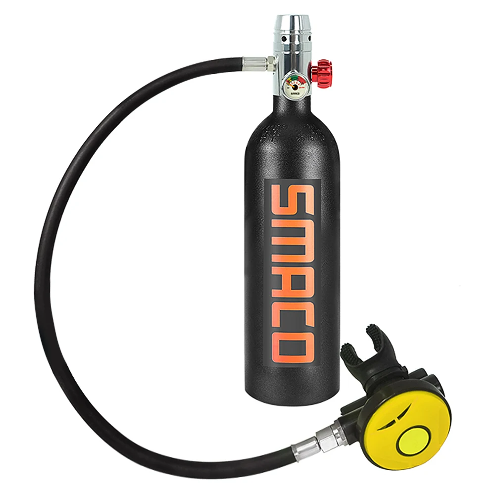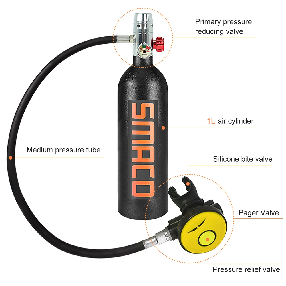 Кислородный цилиндр 1Л позволяет оставаться под водой (не более 10 метров) около 15-20 минут. Три способа для легкой и быстрой надувания: надувается насосом высокого давления (не входит в комплект), заполнен из большого бака адаптером и заполнен электрическим насосом (не входит в комплект) около 8 минут. Портативное оборудование для дайвинга, тренировок или тренировок.