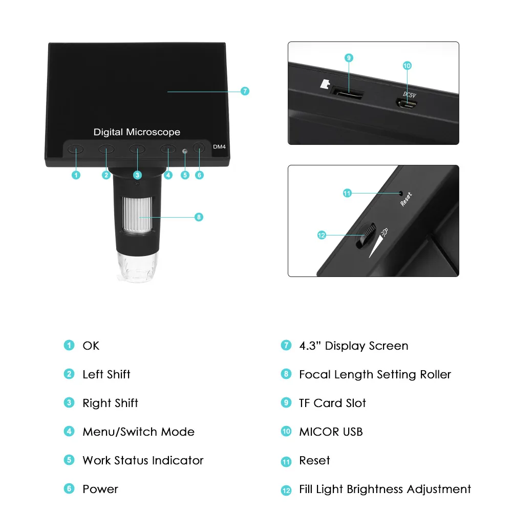 Этот цифровой Микроскоп поставляется с 4,3 дюймов ЖК-дисплей дисплей, 1000X увеличение и Регулируемая высокая яркость 8 светодиодов белого цвета. Это поможет вам видеть и анализировать крошечные предметы в микроскопических деталях. Поставляется с металлической подставкой для поддержки микроскопа для промышленной инспекции, проверки электронных аксессуаров, текстильной инспекции, инспекции ювелирных изделий, инспекции печати и т. д.