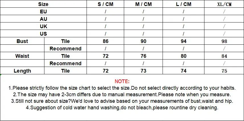 NOTE: 1.Please strictly follow the size chart to select the size.Do not select directly according to your habits. 2.The size may have 2-3cm differs due to manual measurement.Please note when you measure. 3.Still not sure about size?We'd love to advise based on your measurements of bust,waist and hip. 4.Suggestion of cold water hand washing,do not bleach,please rountine dry cleaning.