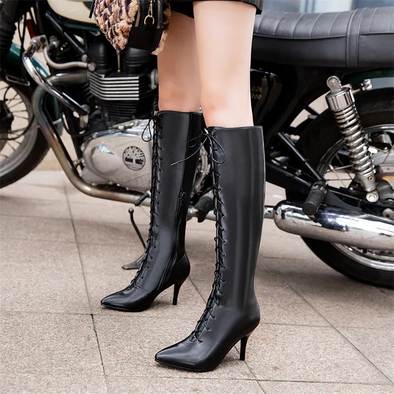 ANNYMOLI/Осенние Сапоги до колена; женские высокие сапоги из искусственной кожи на тонком высоком каблуке; обувь с острым носком на молнии; женская зимняя обувь; большие размеры 33-46
