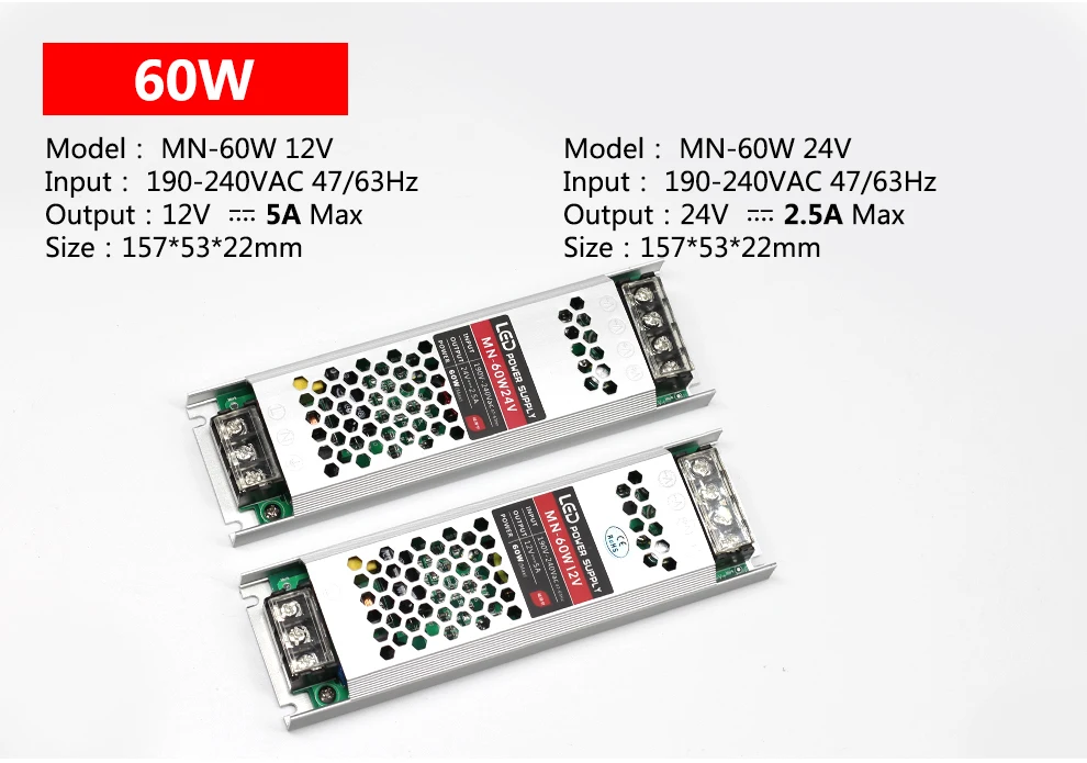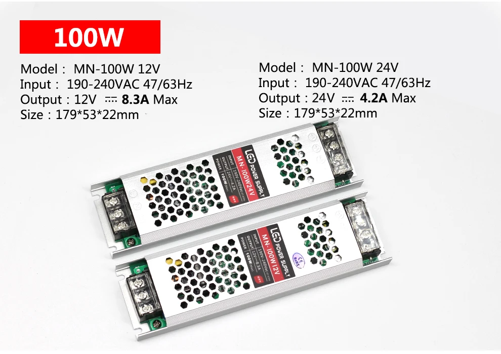 Ультра тонкий импульсный источник питания DC12V 24V Трансформаторы освещения 60W 100W 150W 200W 300W 400W Светодиодный драйвер адаптер для светодиодной ленты Спецификация:Входное напряжение: AC190V-240VВыходное напряжение:Постоянный ток12В/24ВВыходная мощность: 60 Вт/100 Вт/150 Вт/200 Вт/300 Вт/400 ВтМатериал корпуса: металлический корпус/алюминиевый корпусРабочая температура: 0 ~ 40CТемпература хранения: -20 ~ 60CВлажность окружающей среды: 0 ~ 95% без конденсацииВысокая цена-эффективная, надежность с промышленными стандартамиВстроенная защита от перенапряжения, перегрузки по току и короткого замыканияУльтра тонкий 22 мм, высокая эффективность рассеивания тепла, не требуется охлаждающий вентилятор, без шума Фотографии товара:
