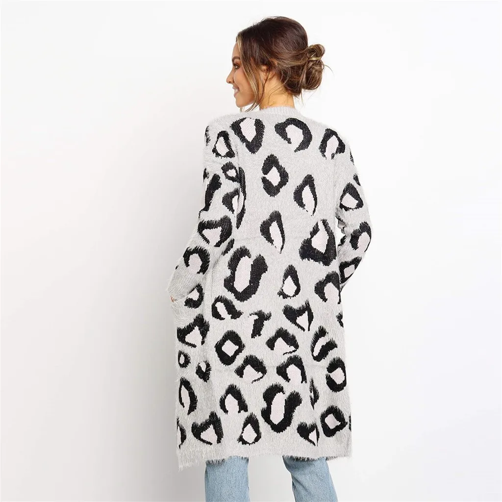 Женский трикотажный свитер с длинными рукавами и карманами с леопардовым принтом; кардиган; большие размеры